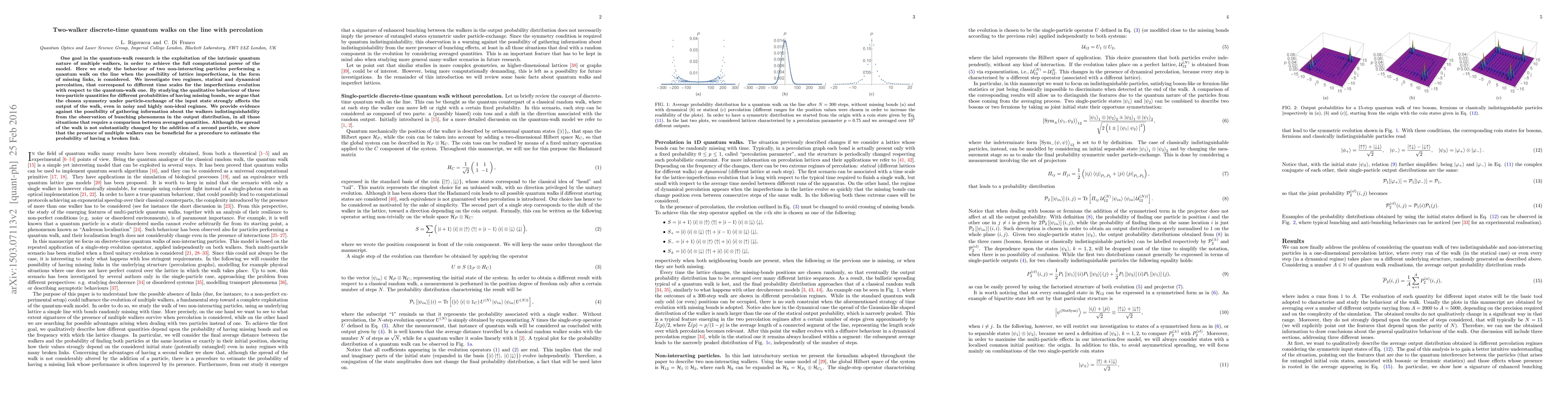 One goal in the quantum-walk research is the exploitation of the intrinsic quantum nature of multiple walkers, in order to achieve the full computational power of the model. Here we study the behaviour of two non-interacting particles performing a quantum walk on the line when the possibility of lattice imperfections, in the form of missing links, is considered. We investigate two regimes, statical and dynamical percolation, that correspond to different time scales for the imperfections evolution with respect to the quantum-walk one. By studying the qualitative behaviour of three two-particle quantities for different probabilities of having missing bonds, we argue that the chosen symmetry under particle-exchange of the input state strongly affects the output of the walk, even in noisy and highly non-ideal regimes. We provide evidence against the possibility of gathering information about the walkers indistinguishability from the observation of bunching phenomena in the output distribution, in all those situations that require a comparison between averaged quantities. Although the spread of the walk is not substantially changed by the addition of a second particle, we show that the presence of multiple walkers can be beneficial for a procedure to estimate the probability of having a broken link.