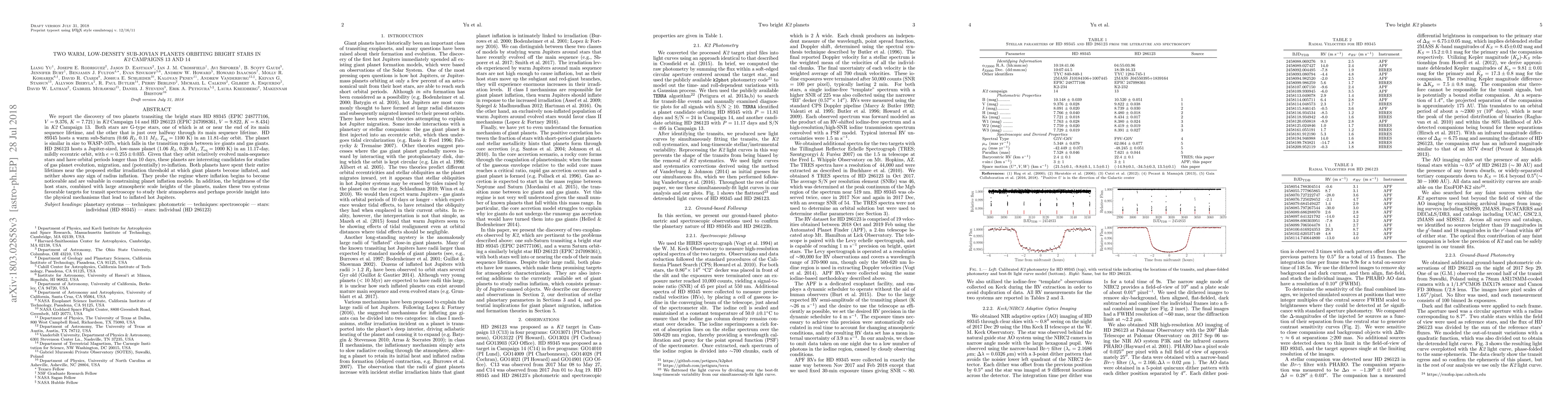 We report the discovery of two planets transiting the bright stars HD 89345 (EPIC 248777106, $V=9.376$, $K=7.721$) in K2 Campaign 14 and HD 286123 (EPIC 247098361, $V=9.822$, $K=8.434$) in K2 Campaign 13. Both stars are G-type stars, one of which is at or near the end of its main sequence lifetime, and the other that is just over halfway through its main sequence lifetime. HD 89345 hosts a warm sub-Saturn (0.66 $R_J$, 0.11 $M_J$, $T_\mathrm{eq}=1100$ K) in an 11.81-day orbit. The planet is similar in size to WASP-107b, which falls in the transition region between ice giants and gas giants. HD 286123 hosts a Jupiter-sized, low-mass planet (1.06 $R_J$, 0.39 $M_J$, $T_\mathrm{eq}=1000$ K) in an 11.17-day, mildly eccentric orbit, with $e=0.255\pm0.035$. Given that they orbit relatively evolved main-sequence stars and have orbital periods longer than 10 days, these planets are interesting candidates for studies of gas planet evolution, migration, and (potentially) re-inflation. Both planets have spent their entire lifetimes near the proposed stellar irradiation threshold at which giant planets become inflated, and neither shows any sign of radius inflation. They probe the regime where inflation begins to become noticeable and are valuable in constraining planet inflation models. In addition, the brightness of the host stars, combined with large atmospheric scale heights of the planets, makes these two systems favorable targets for transit spectroscopy to study their atmospheres and perhaps provide insight into the physical mechanisms that lead to inflated hot Jupiters.