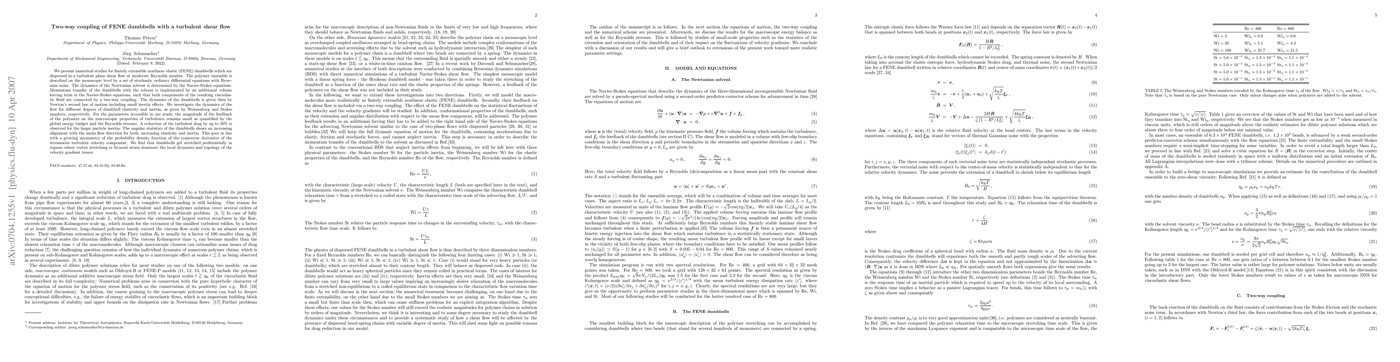 This paper investigates the dynamics of finitely extensible nonlinear elastic (FENE) dumbbells dispersed in a turbulent shear flow through a two-way coupling approach, revealing a small feedback on turbulence and a reduction in turbulent drag by up to 20% for larger particle inertia. The study shows increasing alignment of dumbbells with the mean flow direction, correlating with vortex stretching and bi-axial strain regions.