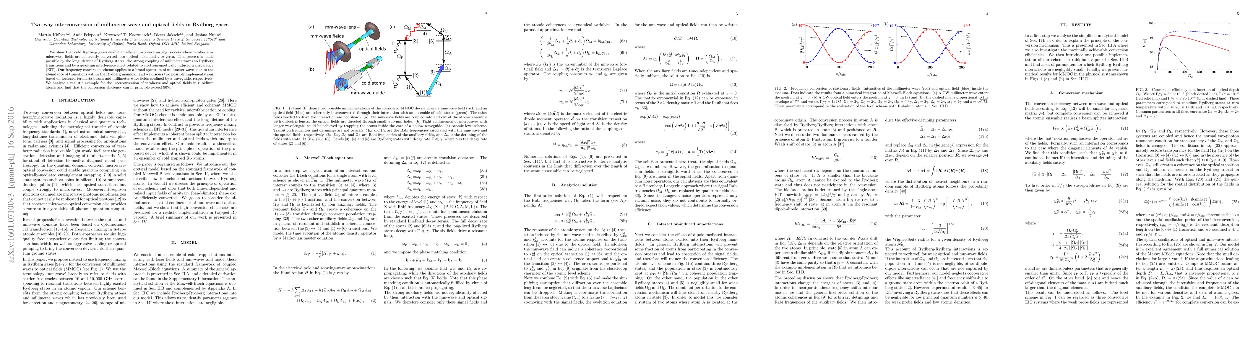 This research demonstrates that cold Rydberg gases can efficiently convert terahertz or microwave fields into optical fields and vice versa via a six-wave mixing process. The conversion is facilitated by Rydberg states' long lifetime, strong coupling of millimeter waves to Rydberg transitions, and a quantum interference effect related to EIT, potentially achieving over 90% efficiency in rubidium atoms.