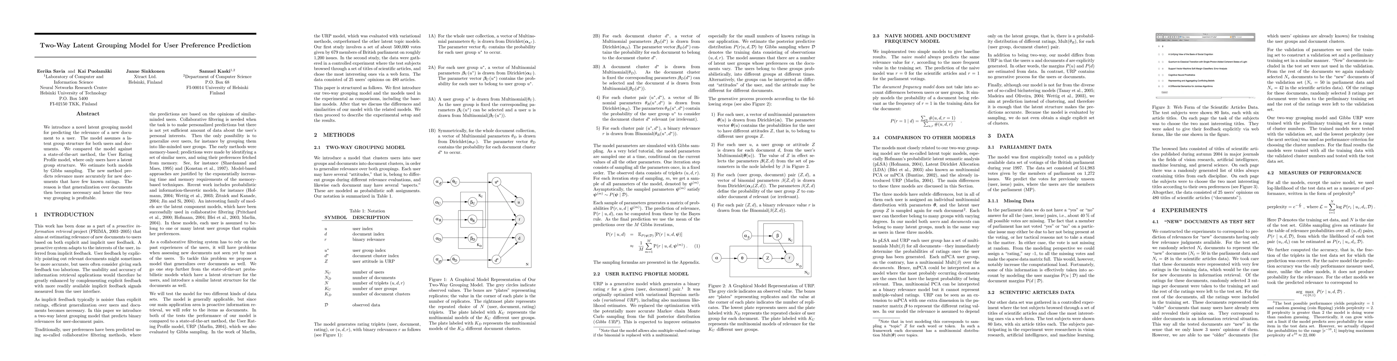 We introduce a novel latent grouping model for predicting the relevance of a new document to a user. The model assumes a latent group structure for both users and documents. We compared the model against a state-of-the-art method, the User Rating Profile model, where only users have a latent group structure. We estimate both models by Gibbs sampling. The new method predicts relevance more accurately for new documents that have few known ratings. The reason is that generalization over documents then becomes necessary and hence the twoway grouping is profitable.