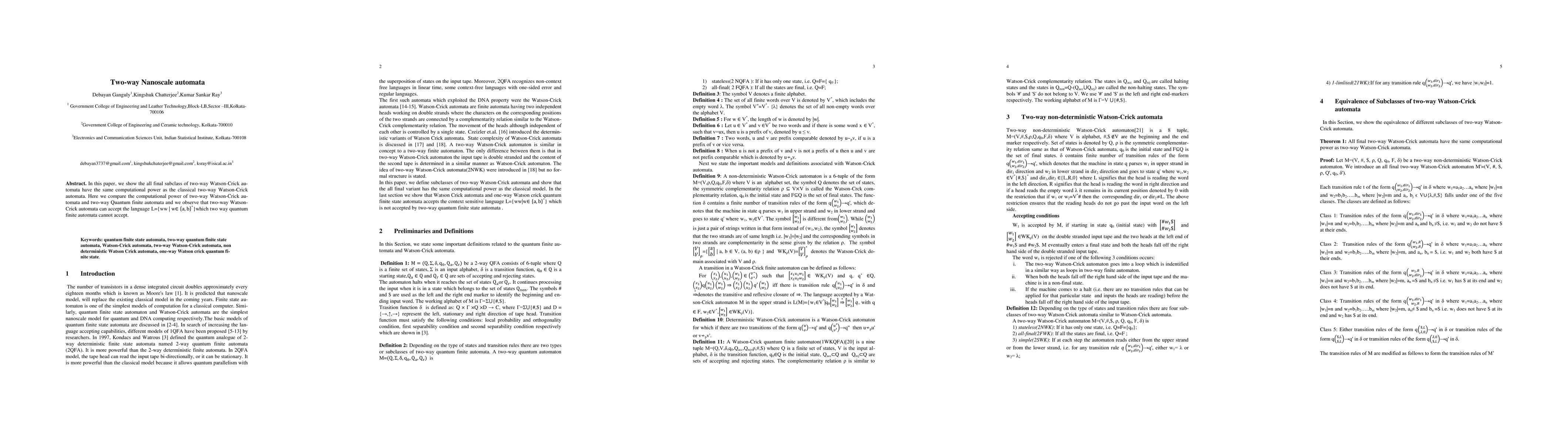 In this paper, we show the all final subclass of two-way Watson-Crick automata have the same computational power as the classical two-way Watson-Crick automata. Here we compare the computational power of two-way Watson-Crick automata and two-way Quantum finite automata and we observe that two-way Watson-Crick automata can accept a language which two-way quantum finite automata cannot accept.