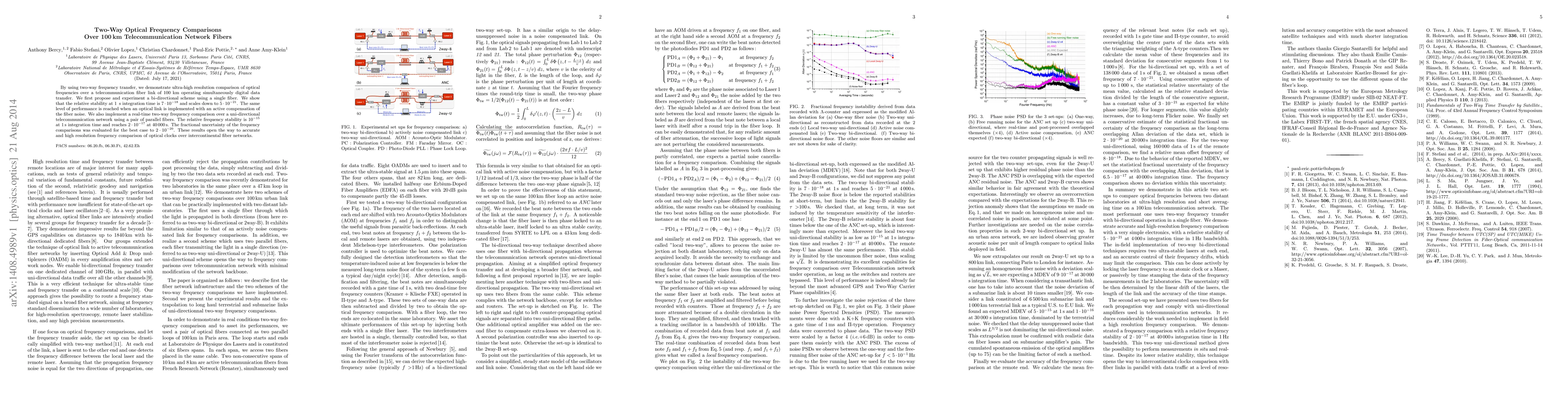 The research proposes and experiments with bi-directional and uni-directional schemes using single and paired fibers for two-way optical frequency comparisons over a 100 km telecommunication network fiber link, simultaneously operating with digital data transfer.