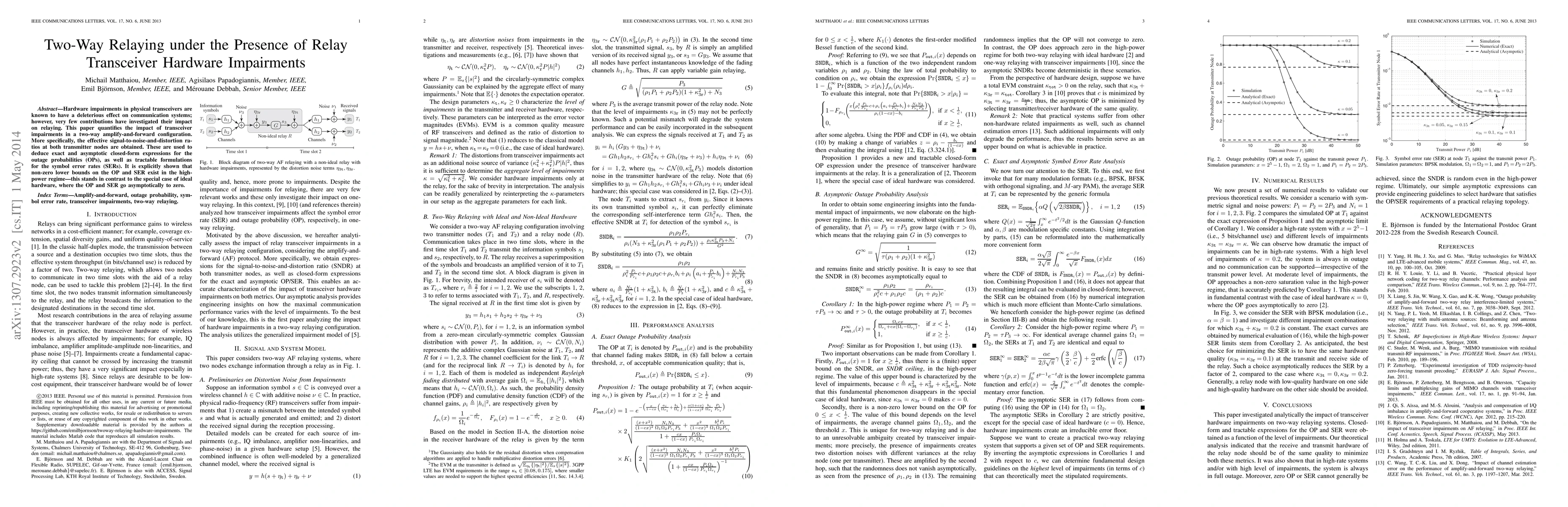 This paper investigates the impact of hardware impairments in transceivers on two-way relaying systems, deriving exact and asymptotic expressions for outage probabilities and symbol error rates. It reveals that non-zero lower bounds exist for these metrics in high-power regimes, contrasting with ideal hardware scenarios.