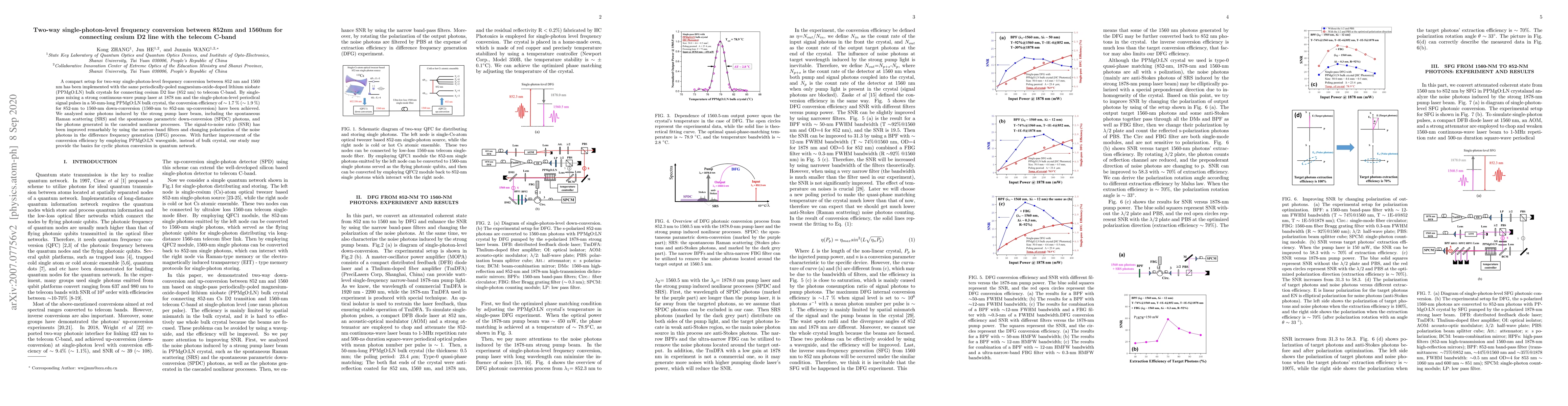This paper presents a compact setup for efficient two-way single-photon-level frequency conversion between 852 nm and 1560 nm using PPMgO:LN crystals, achieving ~1.7% conversion efficiency. The study analyzes noise photons and improves the signal-to-noise ratio, laying groundwork for cyclic photon conversion in quantum networks.