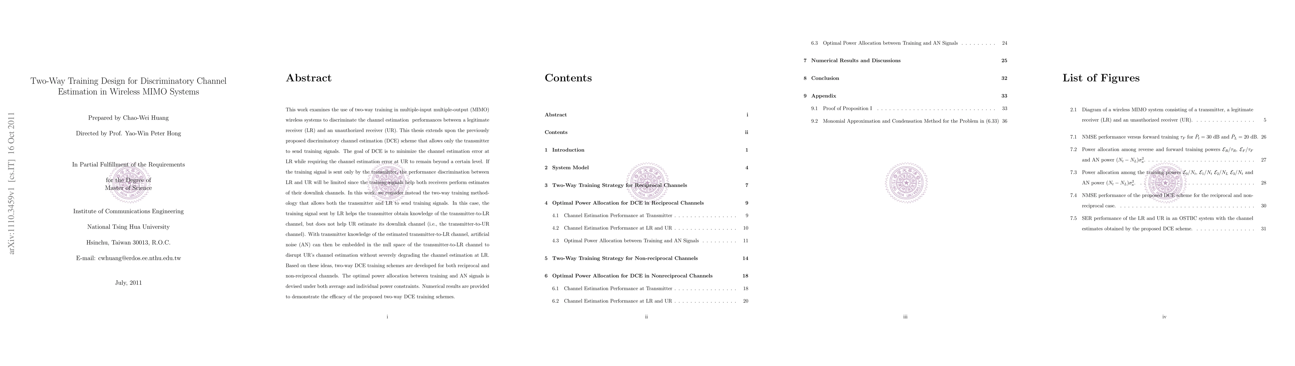 This work examines the use of two-way training in multiple-input multiple-output (MIMO) wireless systems to discriminate the channel estimation performances between a legitimate receiver (LR) and an unauthorized receiver (UR). This thesis extends upon the previously proposed discriminatory channel estimation (DCE) scheme that allows only the transmitter to send training signals. The goal of DCE is to minimize the channel estimation error at LR while requiring the channel estimation error at UR to remain beyond a certain level. If the training signal is sent only by the transmitter, the performance discrimination between LR and UR will be limited since the training signals help both receivers perform estimates of their downlink channels. In this work, we consider instead the two-way training methodology that allows both the transmitter and LR to send training signals. In this case, the training signal sent by LR helps the transmitter obtain knowledge of the transmitter-to-LR channel, but does not help UR estimate its downlink channel (i.e., the transmitter-to-UR channel). With transmitter knowledge of the estimated transmitter-to-LR channel, artificial noise (AN) can then be embedded in the null space of the transmitter-to-LR channel to disrupt UR's channel estimation without severely degrading the channel estimation at LR. Based on these ideas, two-way DCE training schemes are developed for both reciprocal and non-reciprocal channels. The optimal power allocation between training and AN signals is devised under both average and individual power constraints. Numerical results are provided to demonstrate the efficacy of the proposed two-way DCE training schemes.
