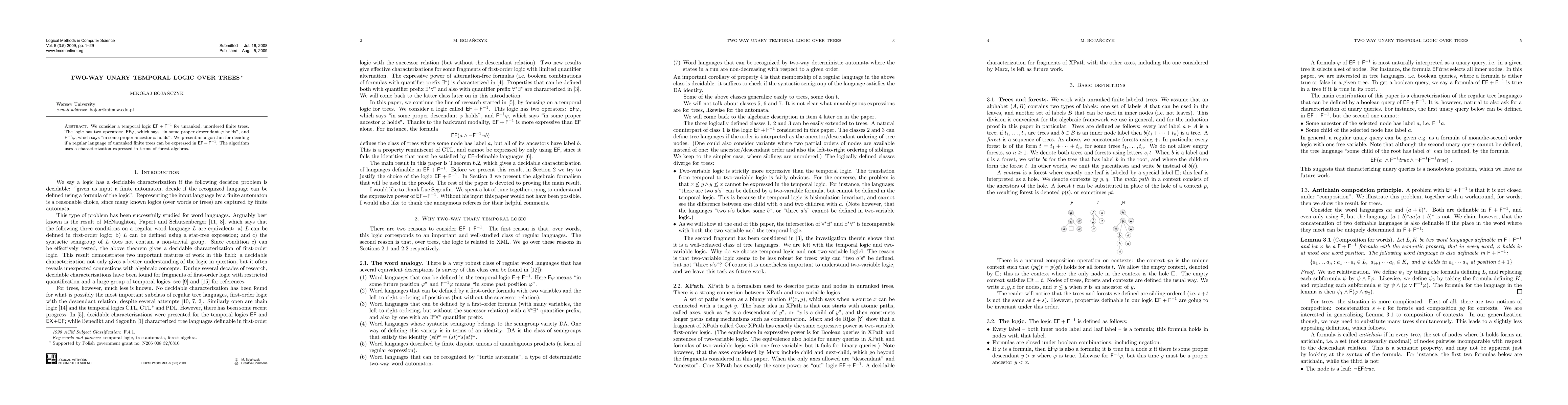 A new algorithm determines if regular languages of unranked finite trees can be expressed using EF+F^-1 temporal logic, a two-way unary logic that considers both ancestors and descendants of tree nodes.