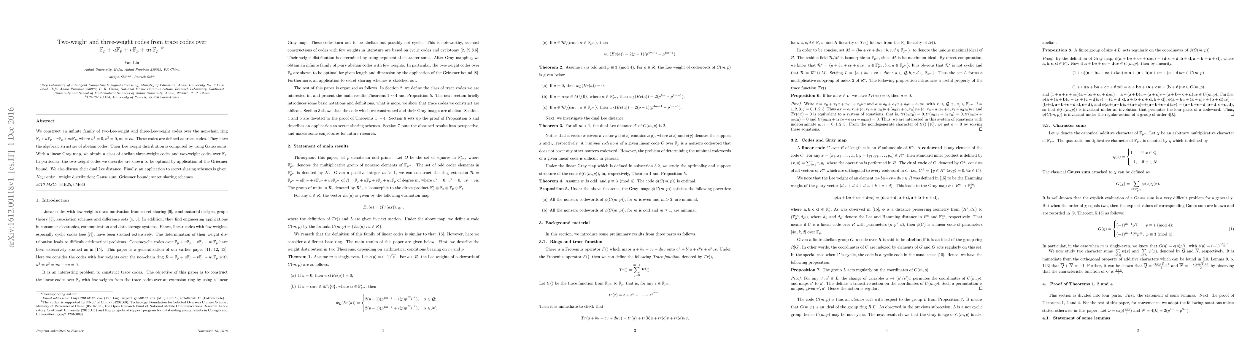 We construct an infinite family of two-Lee-weight and three-Lee-weight codes over the non-chain ring $\mathbb{F}_p+u\mathbb{F}_p+v\mathbb{F}_p+uv\mathbb{F}_p,$ where $u^2=0,v^2=0,uv=vu.$ These codes are defined as trace codes. They have the algebraic structure of abelian codes. Their Lee weight distribution is computed by using Gauss sums. With a linear Gray map, we obtain a class of abelian three-weight codes and two-weight codes over $\mathbb{F}_p$. In particular, the two-weight codes we describe are shown to be optimal by application of the Griesmer bound. We also discuss their dual Lee distance. Finally, an application to secret sharing schemes is given.