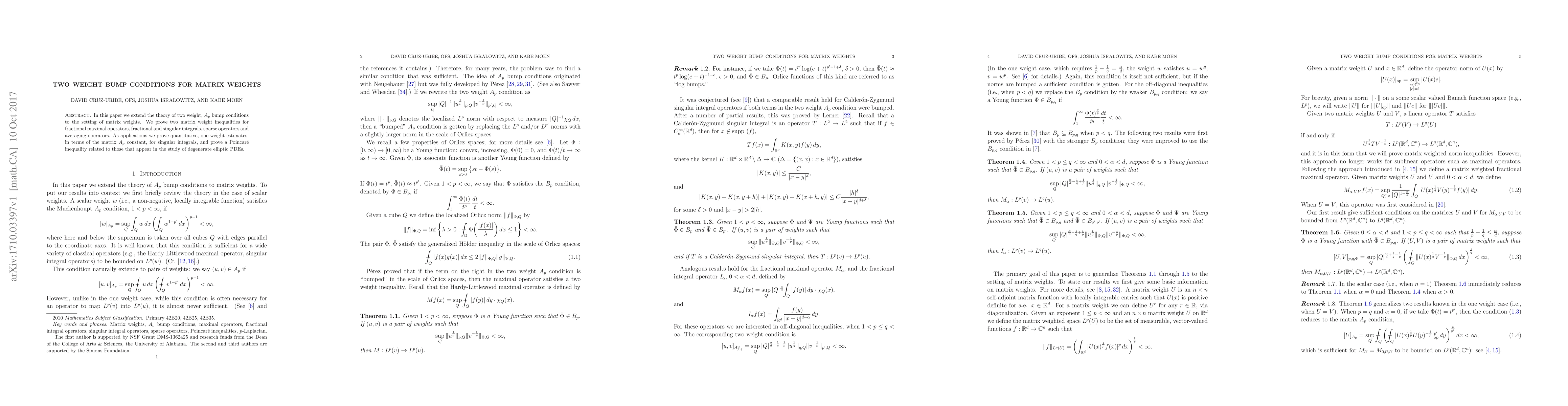 This paper extends the theory of two weight $A_p$ bump conditions to matrix weights, proving new inequalities for various operators. It also establishes quantitative one-weight estimates for singular integrals and a Poincaré inequality relevant to degenerate elliptic PDEs.