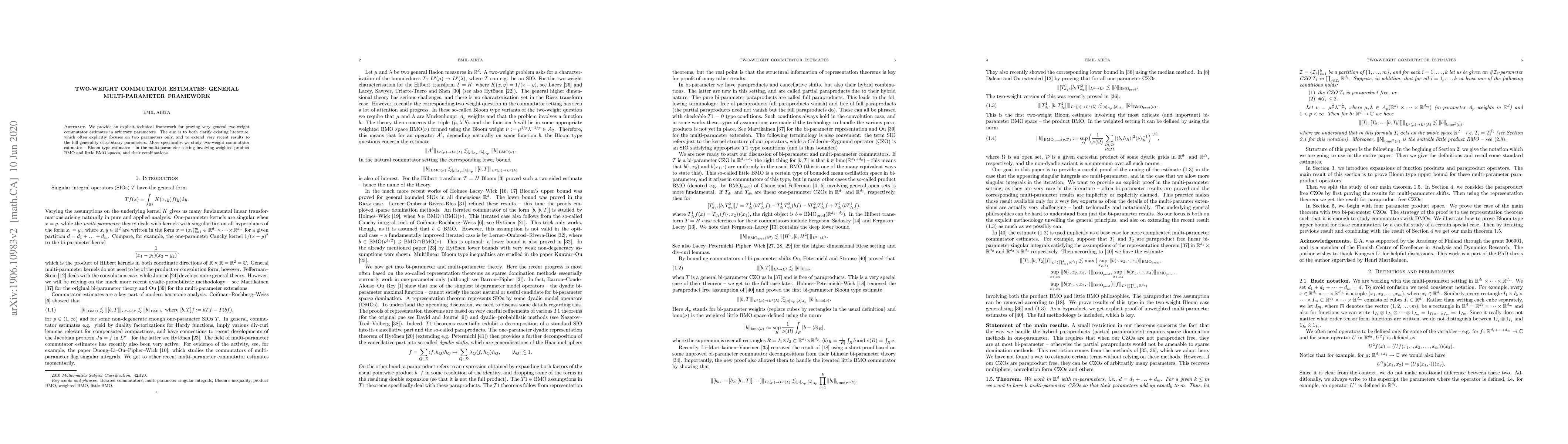 We provide an explicit technical framework for proving very general two-weight commutator estimates in arbitrary parameters. The aim is to both clarify existing literature, which often explicitly focuses on two parameters only, and to extend very recent results to the full generality of arbitrary parameters. More specifically, we study two-weight commutator estimates -- Bloom type estimates -- in the multi-parameter setting involving weighted product BMO and little BMO spaces, and their combinations.