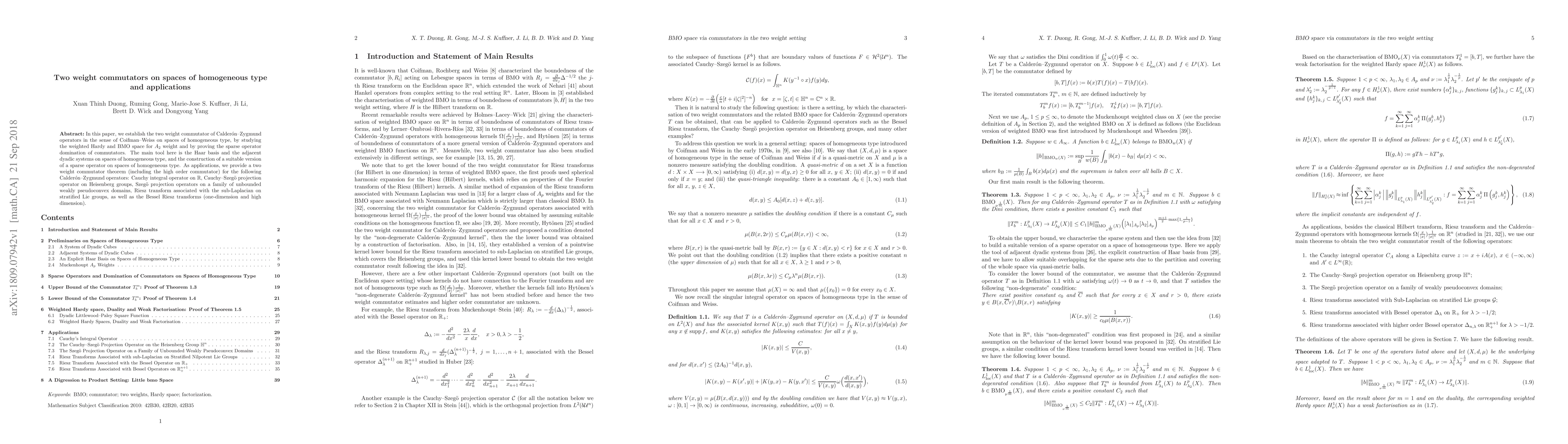 In this paper, we establish the two weight commutator of Calder\'on--Zygmund operators in the sense of Coifman--Weiss on spaces of homogeneous type, by studying the weighted Hardy and BMO space for $A_2$ weight and by proving the sparse operator domination of commutators. The main tool here is the Haar basis and the adjacent dyadic systems on spaces of homogeneous type, and the construction of a suitable version of a sparse operator on spaces of homogeneous type. As applications, we provide a two weight commutator theorem (including the high order commutator) for the following Calder\'on--Zygmund operators: Cauchy integral operator on $\mathbb R$, Cauchy--Szeg\"o projection operator on Heisenberg groups, Szeg\"o projection operators on a family of unbounded weakly pseudoconvex domains, Riesz transform associated with the sub-Laplacian on stratified Lie groups, as well as the Bessel Riesz transforms (one-dimension and high dimension).