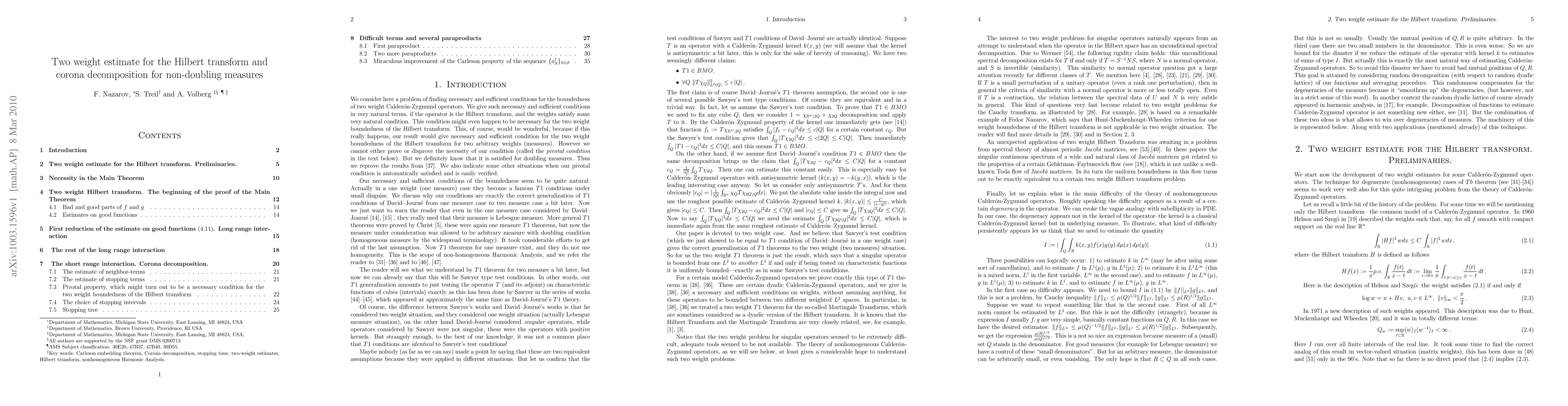 This article was written in 2005 and subsequently lost (at least by the third author). Recently it resurfaced due to one of the colleagues to whom a hard copy has been sent in 2005. We consider here a problem of finding necessary and sufficient conditions for the boundedness of two weight Calder\'on-Zygmund operators. We give such necessary and sufficient conditions in very natural terms, if the operator is the Hilbert transform, and the weights satisfy some very natural condition. The condition on weights was lifted in a recent paper of Michael Lacey, Eric Sawyer and Ignacio Uriarte-Tuero: "A characterization of the two weight norm inequality for the Hilbert transform", arXiv:1001.4043 [math.CA] 31 January 2010. The paper of Lacey--Sawyer-Uriarte-Tuero alliviated the "pivotal" condition used in a present article and replaced it by the very interesting and correct energy condition, which, unlike the "pivotal" condition turned out to be also necessary. The paper of Lacey-Sawyer-Uriarte-Tuero used the present article in its main aspect. The thrust of the present article is to use the methods of nonhomogeneous Harmonoc Analysis together with a several paraproducts arising from a certain stopping time argument. In view of the importance of the present article for Lacey--Sawyer-Uriarte-Tuero's paper arXiv:1001.4043 [math.CA] 31 January 2010, we present it to the attention of the reader. Drawing no parallels, "Darwin spent 1838-1859 getting ready to publish "On the Origin of Species" without actually publishing it, only brooding over beaks of finches".