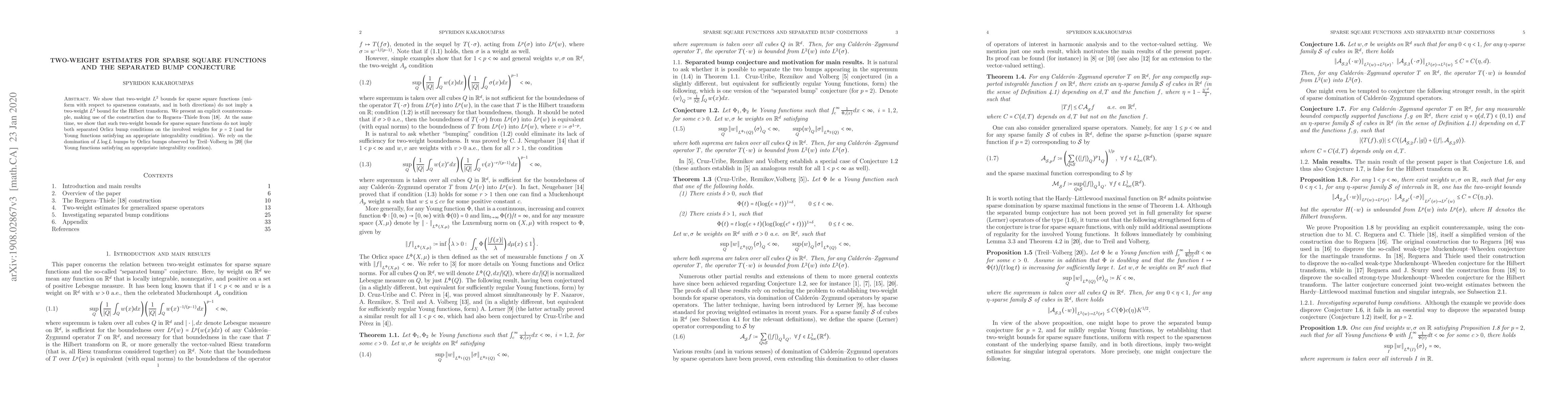 This paper demonstrates that two-weight $L^2$ bounds for sparse square functions do not imply similar bounds for the Hilbert transform or the separated bump conditions for weights when $p=2$. The authors provide an explicit counterexample using a construction from Reguera-Thiele and leverage results on the domination of $L\log L$ bumps by Orlicz bumps.