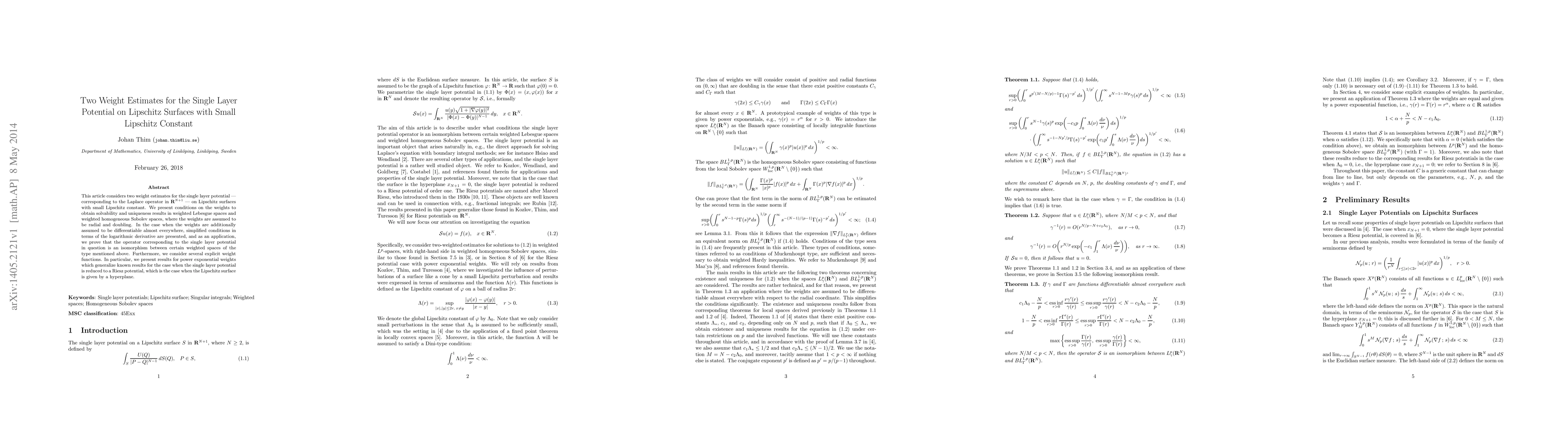 This research provides conditions for weight estimates of the single layer potential on Lipschitz surfaces with small Lipschitz constants, ensuring solvability and uniqueness in specific weighted spaces. It also simplifies conditions when weights are differentiable, proving the single layer potential operator is an isomorphism between certain weighted spaces. The study examines explicit power exponential weight functions, extending previous results for Riesz potentials.