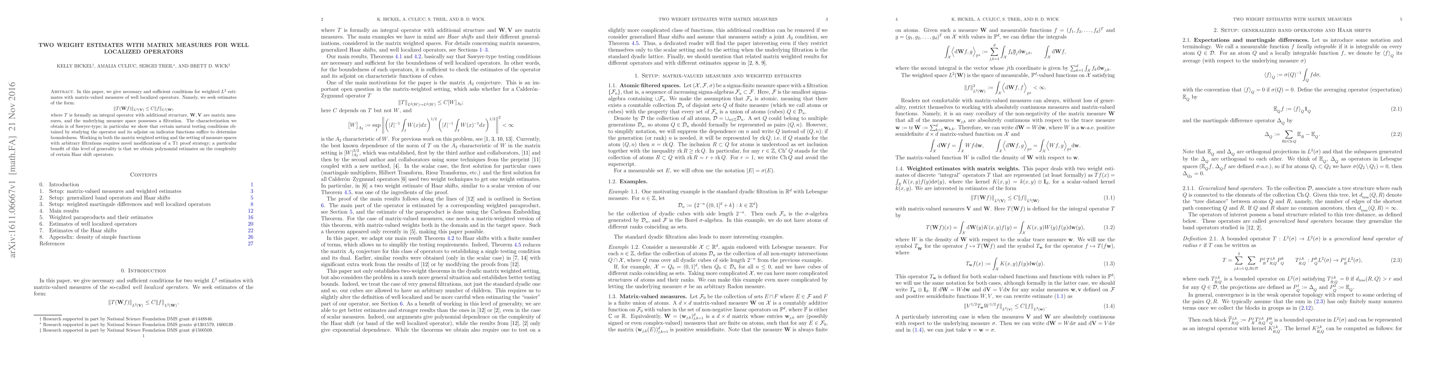 In this paper, we give necessary and sufficient conditions for weighted $L^2$ estimates with matrix-valued measures of well localized operators. Namely, we seek estimates of the form: \[ \| T(\mathbf{W} f)\|_{L^2(\mathbf{V})} \le C\|f\|_{L^2(\mathbf{W})} \] where $T$ is formally an integral operator with additional structure, $\mathbf{W}, \mathbf{V}$ are matrix measures, and the underlying measure space possesses a filtration. The characterization we obtain is of Sawyer-type; in particular we show that certain natural testing conditions obtained by studying the operator and its adjoint on indicator functions suffice to determine boundedness. Working in both the matrix weighted setting and the setting of measure spaces with arbitrary filtrations requires novel modifications of a T1 proof strategy; a particular benefit of this level of generality is that we obtain polynomial estimates on the complexity of certain Haar shift operators.