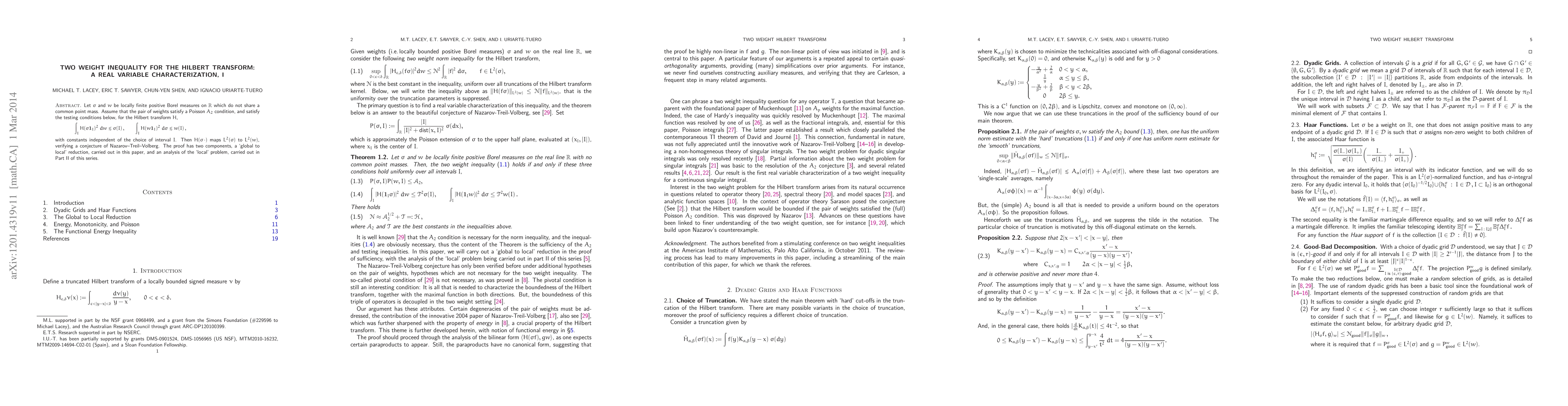 The paper establishes a real-variable characterization of the two weight inequality for the Hilbert transform, proving that the $L^2$ to $L^2$ inequality holds if and only if two $L^2$ to weak-$L^2$ inequalities are satisfied. This result is derived from a two-weight Poisson inequality and testing inequalities on bounded functions.