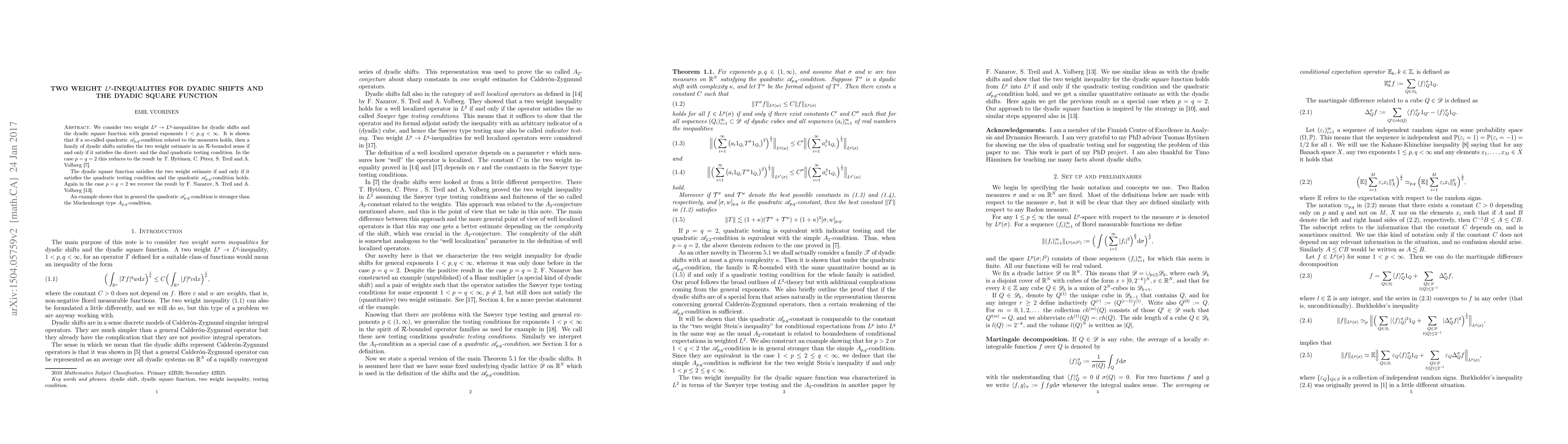 This paper investigates two weight $L^{p}\to L^{q}$-inequalities for dyadic shifts and the dyadic square function, proving that a family of dyadic shifts satisfies the two weight estimate if and only if it meets specific quadratic testing conditions. The results generalize previous findings for $p=q=2$.