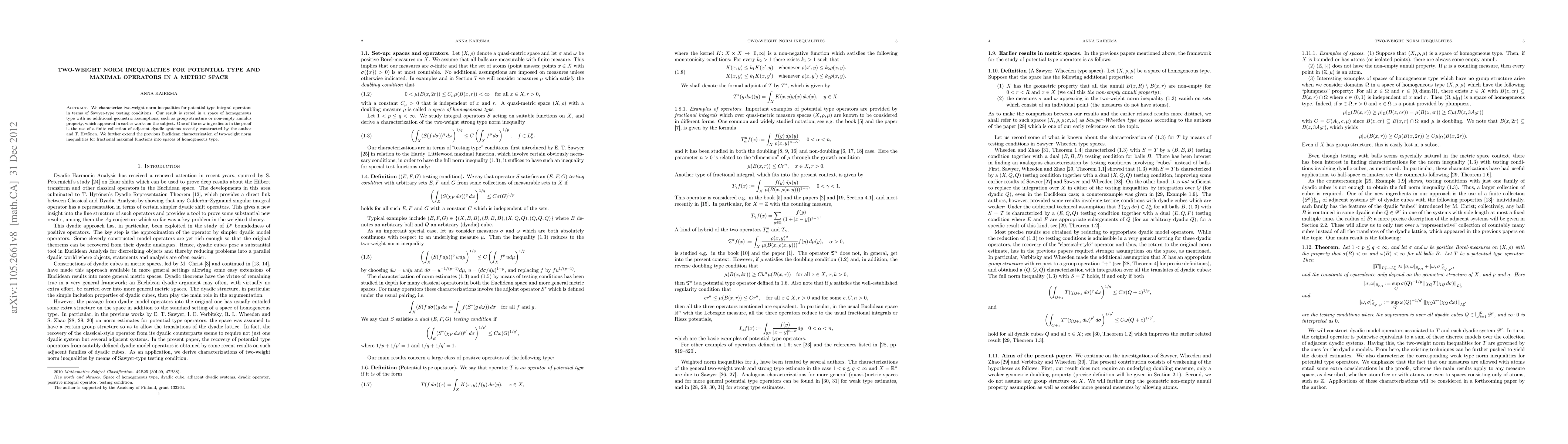 We characterize two-weight norm inequalities for potential type integral operators in terms of Sawyer-type testing conditions. Our result is stated in a space of homogeneous type with no additional geometric assumptions, such as group structure or non-empty annulus property, which appeared in earlier works on the subject. One of the new ingredients in the proof is the use of a finite collection of adjacent dyadic systems recently constructed by the author and T. Hyt\"onen. We further extend the previous Euclidean characterization of two-weight norm inequalities for fractional maximal functions into spaces of homogeneous type.