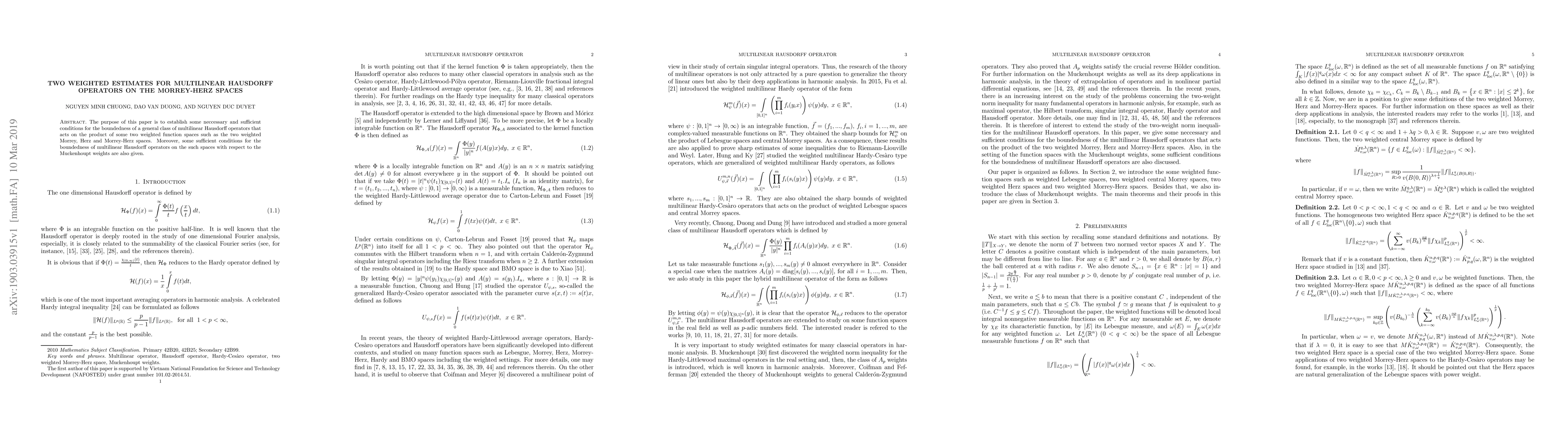 The purpose of this paper is to establish some neccessary and sufficient conditions for the boundedness of a general class of multilinear Hausdorff operators that acts on the product of some two weighted function spaces such as the two weighted Morrey, Herz and Morrey-Herz spaces. Moreover, some sufficient conditions for the boundedness of multilinear Hausdorff operators on the such spaces with respect to the Muckenhoupt weights are also given.