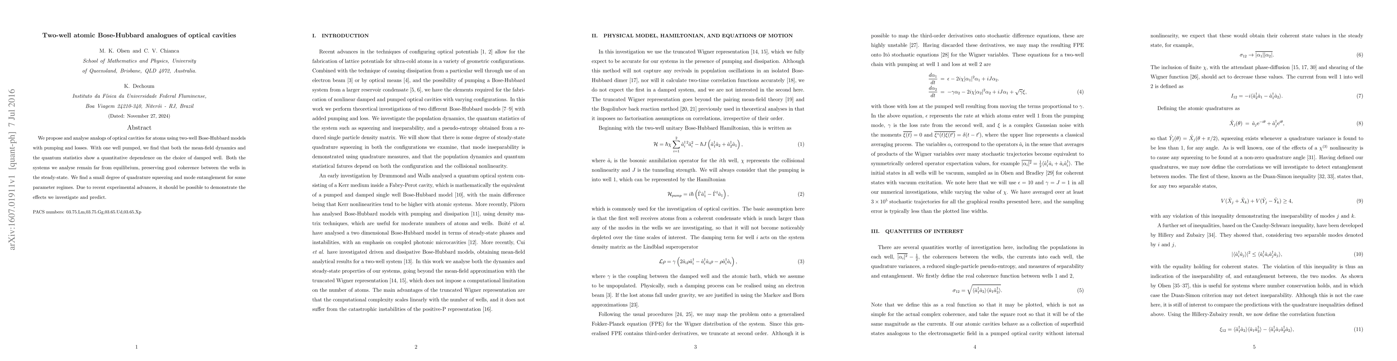 We propose and analyse analogs of optical cavities for atoms using two-well Bose-Hubbard models with pumping and losses. With one well pumped, we find that both the mean-field dynamics and the quantum statistics show a quantitative dependence on the choice of damped well. Both the systems we analyse remain far from equilibrium, preserving good coherence between the wells in the steady-state. We find a small degree of quadrature squeezing and mode entanglement for some parameter regimes. Due to recent experimental advances, it should be possible to demonstrate the effects we investigate and predict.