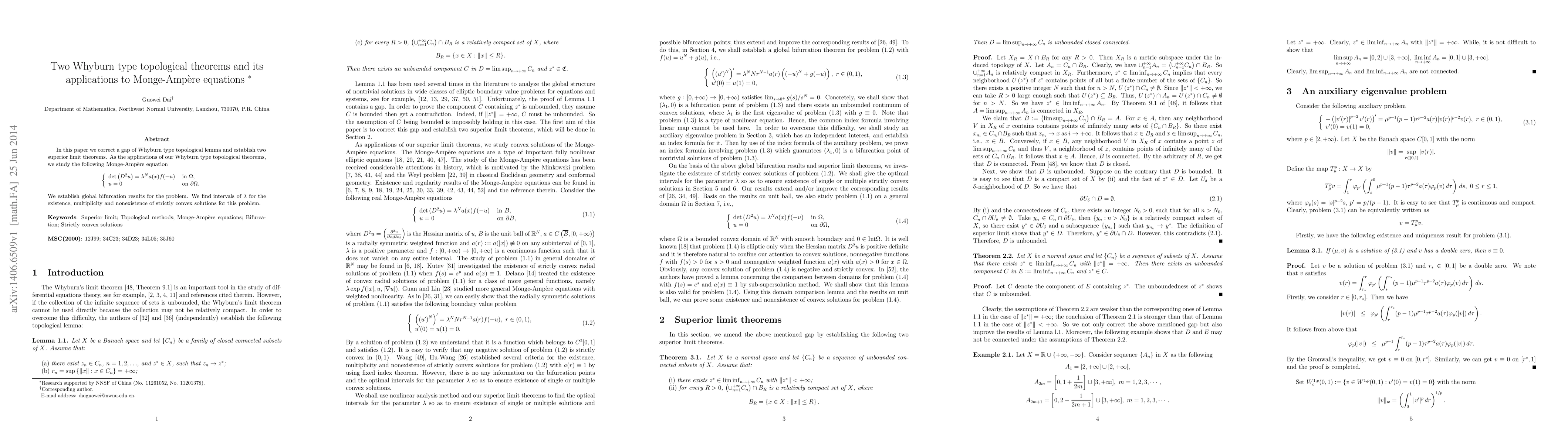 In this paper we correct a gap of Whyburn type topological lemma and establish two superior limit theorems. As the applications of our Whyburn type topological theorems, we study the following Monge-Amp\`{e}re equation \begin{eqnarray} \left\{ \begin{array}{lll} \det\left(D^2u\right)=\lambda^N a(x)f(-u)\,\, &\text{in}\,\, \Omega,\\ u=0~~~~~~~~~~~~~~~~~~~~~~\,\,&\text{on}\,\, \partial \Omega. \end{array} \right.\nonumber \end{eqnarray} We establish global bifurcation results for the problem. We find intervals of $\lambda$ for the existence, multiplicity and nonexistence of strictly convex solutions for this problem.