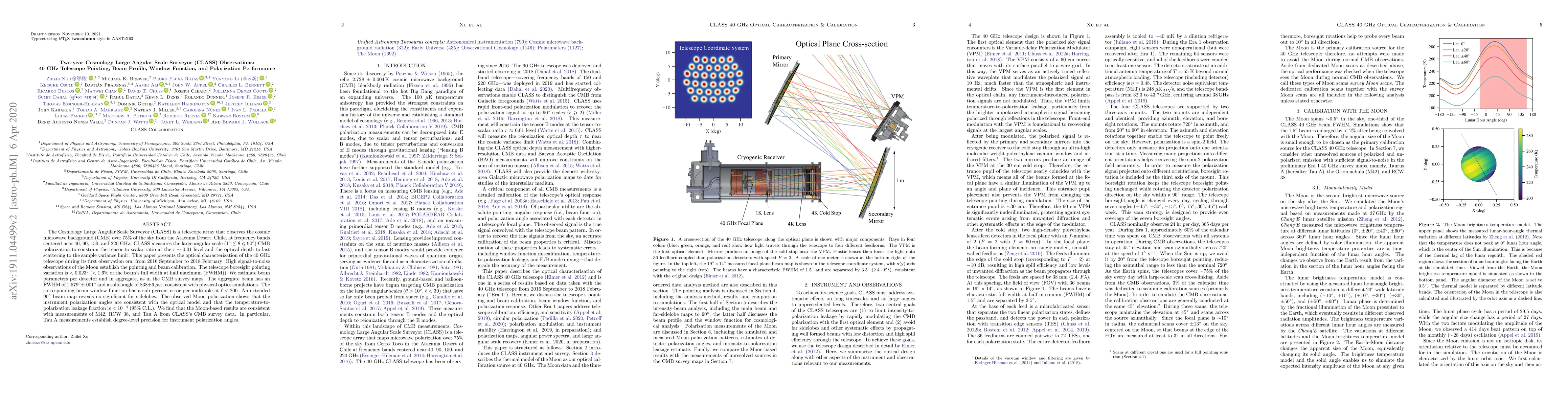 The CLASS telescope array has been used to study the cosmic microwave background, with key findings including precise beam characterization and polarization measurements that constrain the tensor-to-scalar ratio and optical depth.