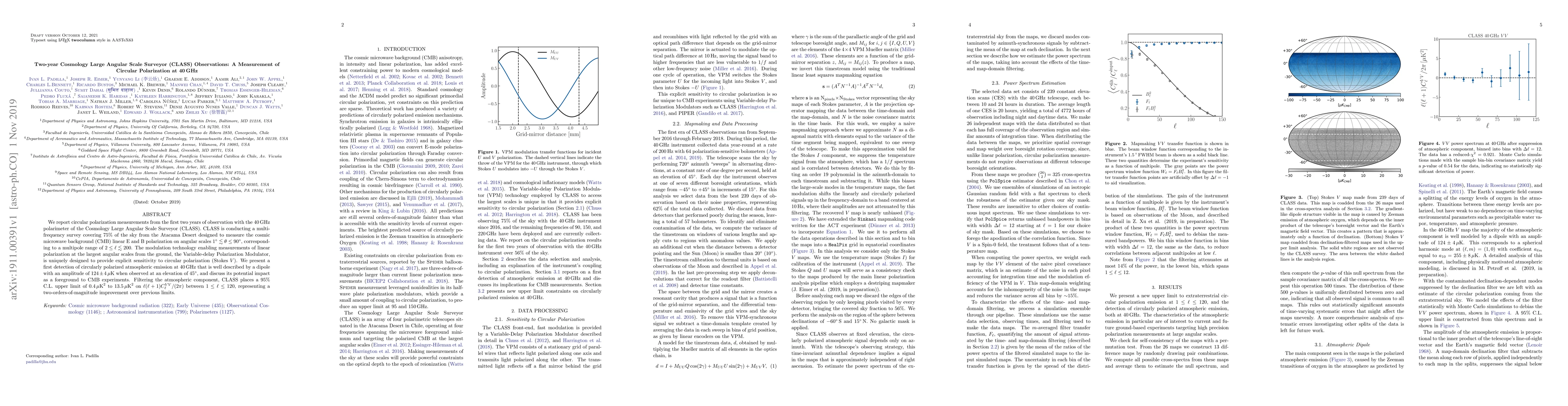 We report circular polarization measurements from the first two years of observation with the 40 GHz polarimeter of the Cosmology Large Angular Scale Surveyor (CLASS). CLASS is conducting a multi-frequency survey covering 75% of the sky from the Atacama Desert designed to measure the cosmic microwave background (CMB) linear E and B polarization on angular scales $1^\circ \lesssim \theta \leq 90^\circ$, corresponding to a multipole range of $2 \leq \ell \lesssim 200$. The modulation technology enabling measurements of linear polarization at the largest angular scales from the ground, the Variable-delay Polarization Modulator, is uniquely designed to provide explicit sensitivity to circular polarization (Stokes $V$). We present a first detection of circularly polarized atmospheric emission at 40 GHz that is well described by a dipole with an amplitude of $124\pm4\,\mathrm{\mu K}$ when observed at an elevation of $45^\circ$, and discuss its potential impact as a foreground to CMB experiments. Filtering the atmospheric component, CLASS places a 95% C.L. upper limit of $0.4\,\mathrm{\mu K}^2$ to $13.5\,\mathrm{\mu K}^2$ on $\ell(\ell+1)C_\ell^{VV}/(2\pi)$ between $1 \leq \ell \leq 120$, representing a two-orders-of-magnitude improvement over previous limits.