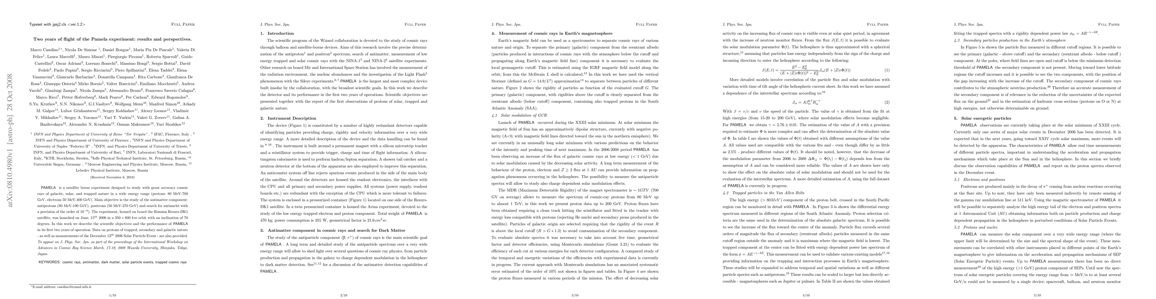 This paper summarizes the first two years of the PAMELA satellite experiment, which precisely measures cosmic rays including protons, electrons, and antimatter components like antiprotons and positrons. The findings highlight the experiment's performance and provide data on trapped protons and a notable solar particle event.