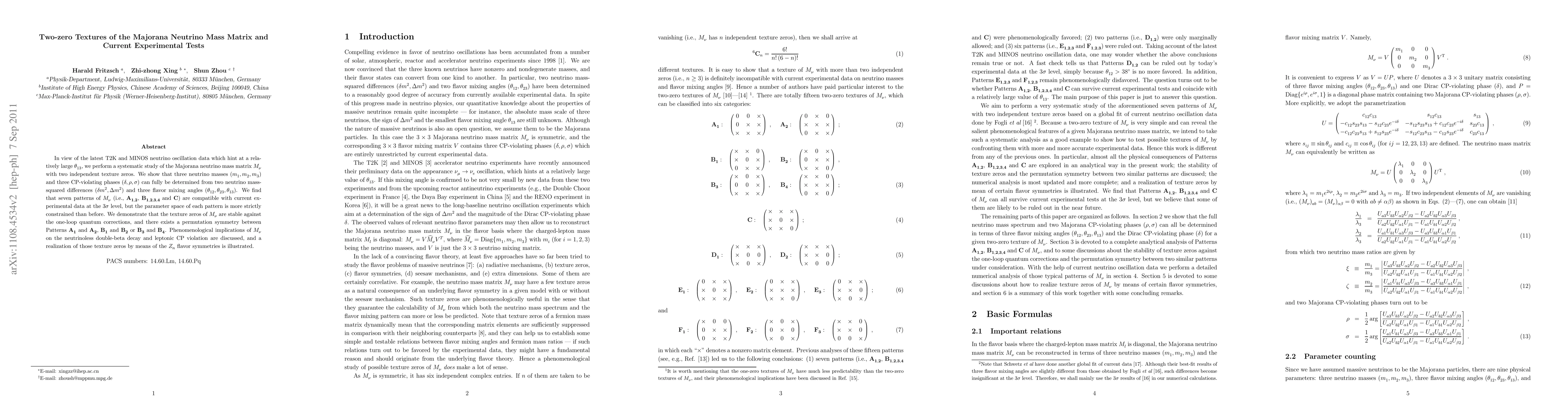 In view of the latest T2K and MINOS neutrino oscillation data which hint at a relatively large theta_13, we perform a systematic study of the Majorana neutrino mass matrix M_nu with two independent texture zeros. We show that three neutrino masses (m_1, m_2, m_3) and three CP-violating phases (delta, rho, sigma) can fully be determined from two neutrino mass-squared differences (delta m^2, Delta m^2) and three flavor mixing angles (theta_12, theta_23, theta_13). We find that seven patterns of M_nu (i.e., A_{1,2}, B_{1,2,3,4} and C) are compatible with current experimental data at the 3-sigma level, but the parameter space of each pattern is more strictly constrained than before. We demonstrate that the texture zeros of M_nu are stable against the one-loop quantum corrections, and there exists a permutation symmetry between Patterns A_1 and A_2, B_1 and B_2 or B_3 and B_4. Phenomenological implications of M_nu on the neutrinoless double-beta decay and leptonic CP violation are discussed, and a realization of those texture zeros by means of the Z_n flavor symmetries is illustrated.