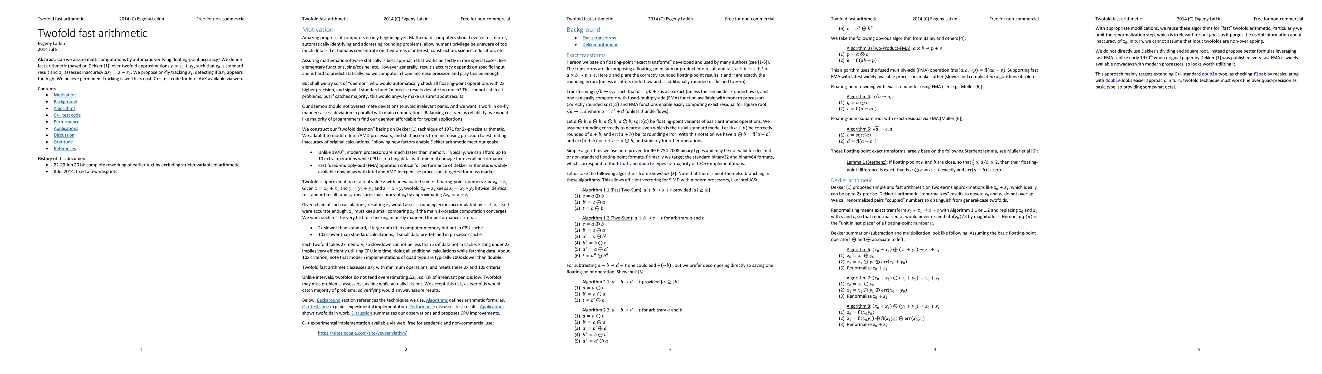 Summary: The paper proposes a fast arithmetic method that uses twofold approximations to automatically verify floating-point accuracy during computations. It suggests on-the-fly tracking of approximation errors to detect inaccuracies and advocates for its cost-effectiveness despite the additional processing. C++ test code is provided for Intel AVX implementation.
