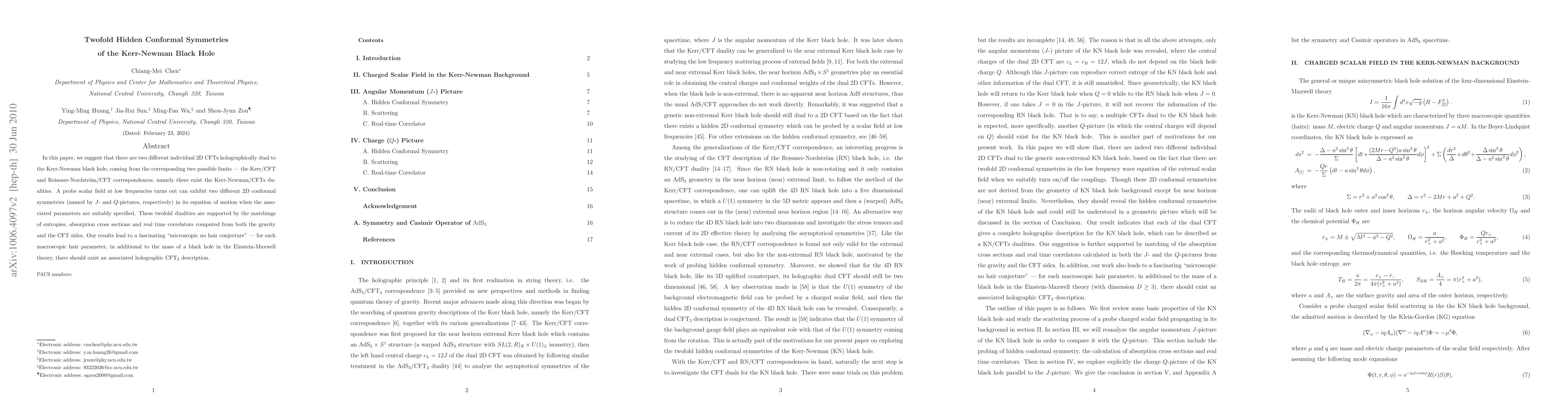 The Kerr-Newman black hole has two holographically dual 2D conformal theories (CFTs), each with its own set of symmetries and implications for the 'microscopic no hair conjecture'.