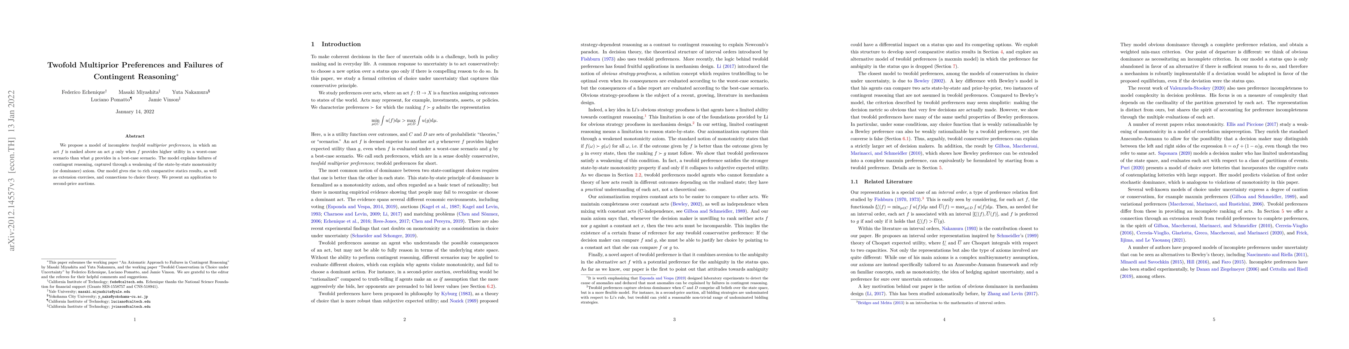 We propose a model of incomplete \textit{twofold multiprior preferences}, in which an act $f$ is ranked above an act $g$ only when $f$ provides higher utility in a worst-case scenario than what $g$ provides in a best-case scenario. The model explains failures of contingent reasoning, captured through a weakening of the state-by-state monotonicity (or dominance) axiom. Our model gives rise to rich comparative statics results, as well as extension exercises, and connections to choice theory. We present an application to second-price auctions.