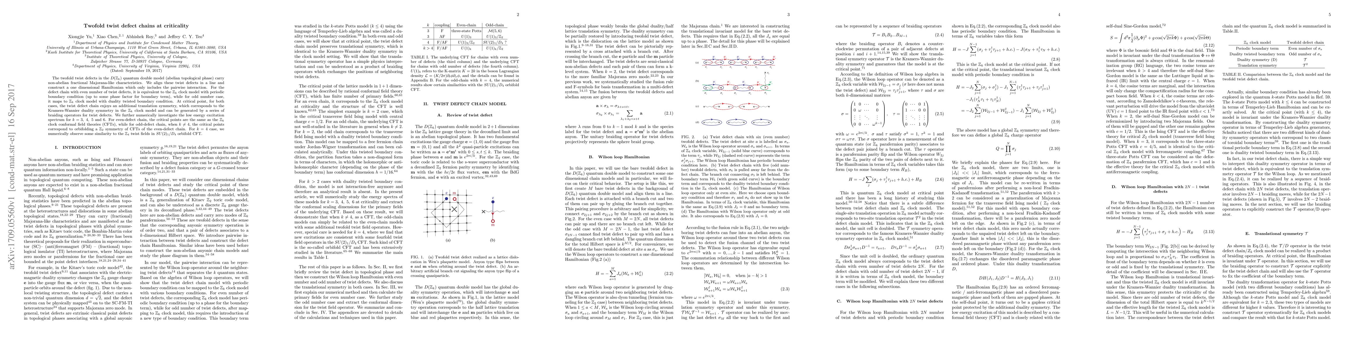 The twofold twist defects in the $D(\mathbb{Z}_k)$ quantum double model (abelian topological phase) carry non-abelian fractional Majorana-like characteristics. We align these twist defects in a line and construct a one dimensional Hamiltonian which only includes the pairwise interaction. For the defect chain with even number of twist defects, it is equivalent to the $\mathbb{Z}_k$ clock model with periodic boundary condition (up to some phase factor for boundary term), while for odd number case, it maps to $\mathbb{Z}_k$ clock model with duality twisted boundary condition. At critical point, for both cases, the twist defect chain enjoys an additional translation symmetry, which corresponds to the Kramers-Wannier duality symmetry in the $\mathbb{Z}_k$ clock model and can be generated by a series of braiding operators for twist defects. We further numerically investigate the low energy excitation spectrum for $k=3,~4,~5$ and $6$. For even-defect chain, the critical points are the same as the $\mathbb{Z}_k$ clock conformal field theories (CFTs), while for odd-defect chain, when $k\neq 4$, the critical points correspond to orbifolding a $\mathbb{Z}_2$ symmetry of CFTs of the even-defect chain. For $k=4$ case, we numerically observe some similarity to the $\mathbb{Z}_4$ twist fields in $SU(2)_1/D_4$ orbifold CFT.