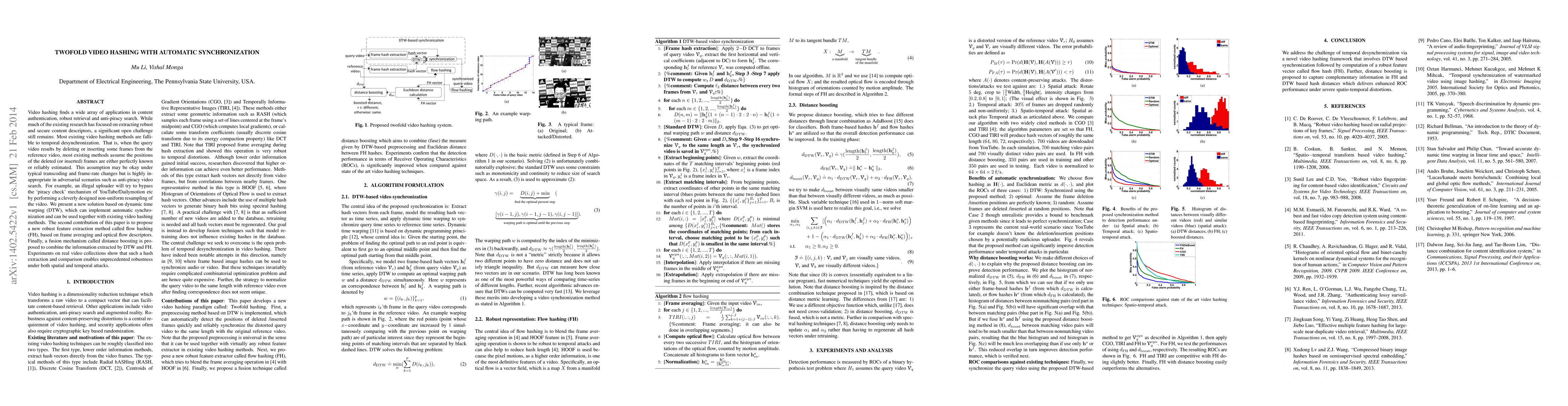Video hashing finds a wide array of applications in content authentication, robust retrieval and anti-piracy search. While much of the existing research has focused on extracting robust and secure content descriptors, a significant open challenge still remains: Most existing video hashing methods are fallible to temporal desynchronization. That is, when the query video results by deleting or inserting some frames from the reference video, most existing methods assume the positions of the deleted (or inserted) frames are either perfectly known or reliably estimated. This assumption may be okay under typical transcoding and frame-rate changes but is highly inappropriate in adversarial scenarios such as anti-piracy video search. For example, an illegal uploader will try to bypass the 'piracy check' mechanism of YouTube/Dailymotion etc by performing a cleverly designed non-uniform resampling of the video. We present a new solution based on dynamic time warping (DTW), which can implement automatic synchronization and can be used together with existing video hashing methods. The second contribution of this paper is to propose a new robust feature extraction method called flow hashing (FH), based on frame averaging and optical flow descriptors. Finally, a fusion mechanism called distance boosting is proposed to combine the information extracted by DTW and FH. Experiments on real video collections show that such a hash extraction and comparison enables unprecedented robustness under both spatial and temporal attacks.