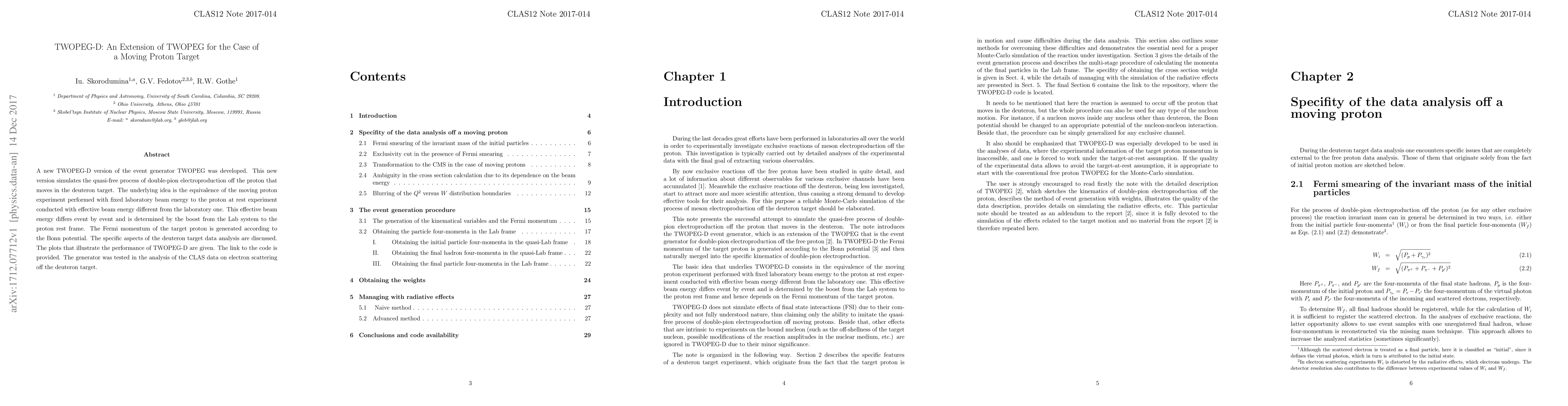A new TWOPEG-D version of the event generator TWOPEG was developed. This new version simulates the quasi-free process of double-pion electroproduction off the proton that moves in the deuteron target. The underlying idea is the equivalence of the moving proton experiment performed with fixed laboratory beam energy to the proton at rest experiment conducted with effective beam energy different from the laboratory one. This effective beam energy differs event by event and is determined by the boost from the Lab system to the proton rest frame. The Fermi momentum of the target proton is generated according to the Bonn potential. The specific aspects of the deuteron target data analysis are discussed. The plots that illustrate the performance of TWOPEG-D are given. The link to the code is provided. The generator was tested in the analysis of the CLAS data on electron scattering off the deuteron target.