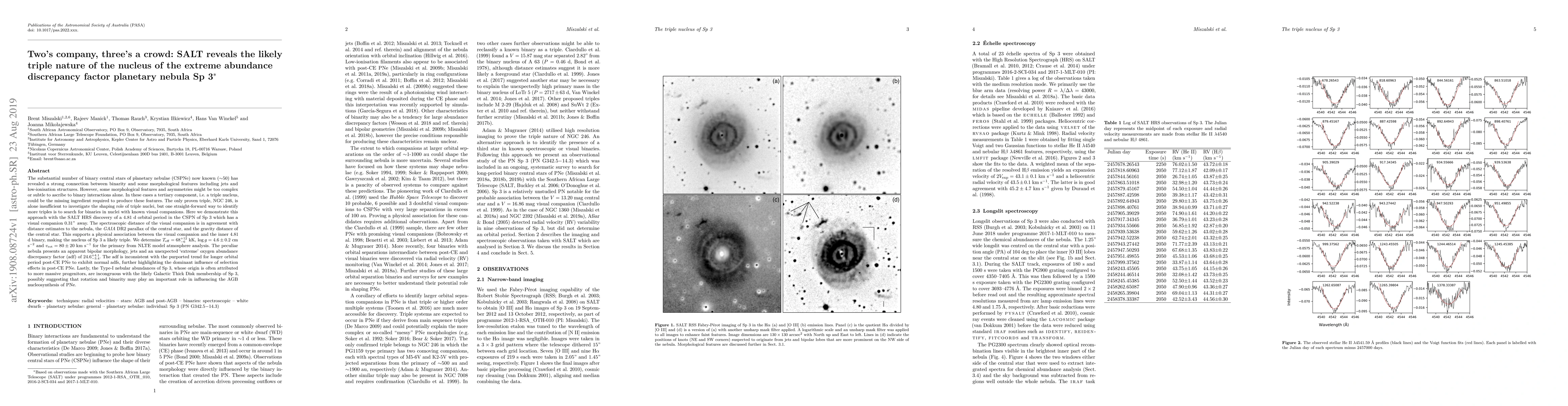 Astronomers have found evidence that a planetary nebula known as Sp 3 may have a triple nucleus, with a binary star system at its center and a third companion star nearby.