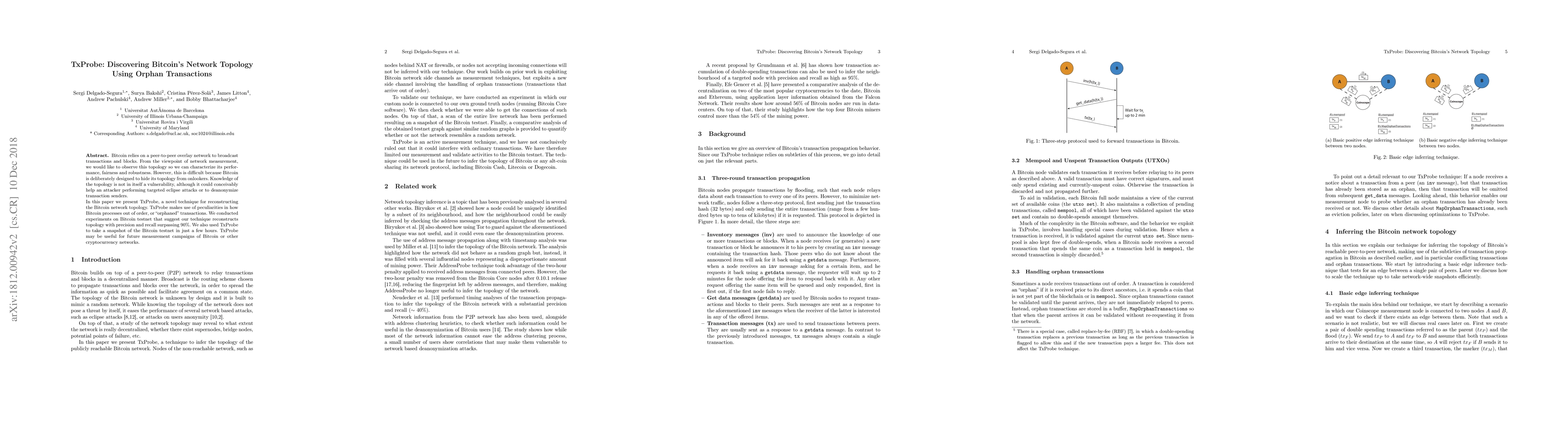 TxProbe is a novel technique for reconstructing Bitcoin's network topology using orphaned transactions. Experiments on Bitcoin testnet show it achieves over 90% precision and recall, offering insights into network performance and robustness.
