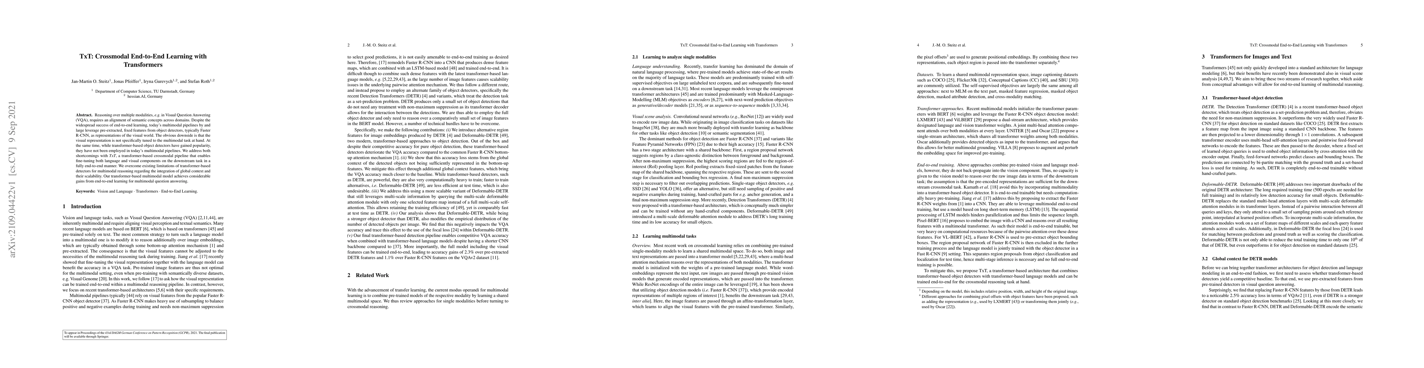 Reasoning over multiple modalities, e.g. in Visual Question Answering (VQA), requires an alignment of semantic concepts across domains. Despite the widespread success of end-to-end learning, today's multimodal pipelines by and large leverage pre-extracted, fixed features from object detectors, typically Faster R-CNN, as representations of the visual world. The obvious downside is that the visual representation is not specifically tuned to the multimodal task at hand. At the same time, while transformer-based object detectors have gained popularity, they have not been employed in today's multimodal pipelines. We address both shortcomings with TxT, a transformer-based crossmodal pipeline that enables fine-tuning both language and visual components on the downstream task in a fully end-to-end manner. We overcome existing limitations of transformer-based detectors for multimodal reasoning regarding the integration of global context and their scalability. Our transformer-based multimodal model achieves considerable gains from end-to-end learning for multimodal question answering.