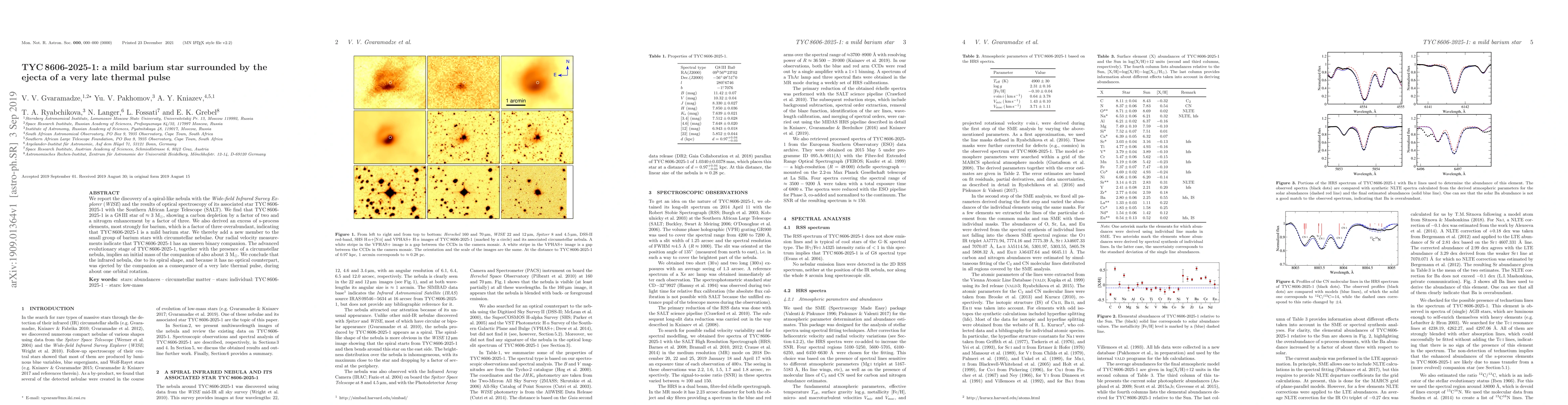 We report the discovery of a spiral-like nebula with the Wide-field Infrared Survey Explorer (WISE) and the results of optical spectroscopy of its associated star TYC 8606-2025-1 with the Southern African Large Telescope (SALT). We find that TYC 8606-2025-1 is a G8 III star of $\approx3$ M$_\odot$, showing a carbon depletion by a factor of two and a nitrogen enhancement by a factor of three. We also derived an excess of s-process elements, most strongly for barium, which is a factor of three overabundant, indicating that TYC 8606-2025-1 is a mild barium star. We thereby add a new member to the small group of barium stars with circumstellar nebulae. Our radial velocity measurements indicate that TYC 8606-2025-1 has an unseen binary companion. The advanced evolutionary stage of TYC 8606-2025-1, together with the presence of a circumstellar nebula, implies an initial mass of the companion of also about 3 M$_\odot$. We conclude that the infrared nebula, due to its spiral shape, and because it has no optical counterpart, was ejected by the companion as a consequence of a very late thermal pulse, during about one orbital rotation.