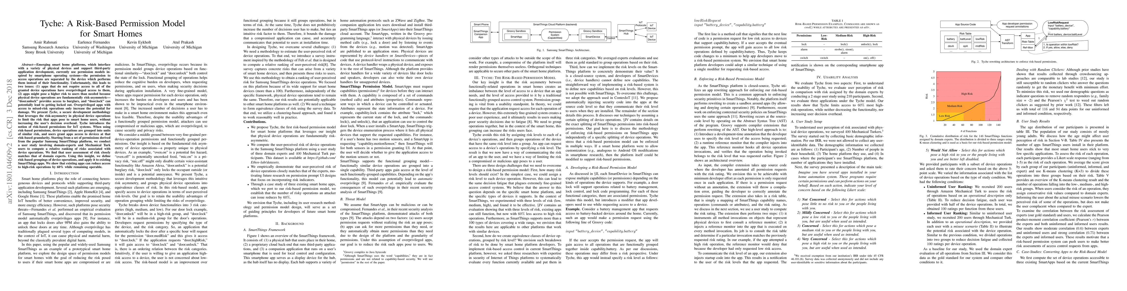 Tyche introduces a risk-based permission model for smart home platforms to address overprivileged access issues by grouping device operations into risk-level units, thereby limiting the potential risks posed by apps without increasing user decision overhead. The system was validated through a user study showing that user risk assessments align closely with domain experts.