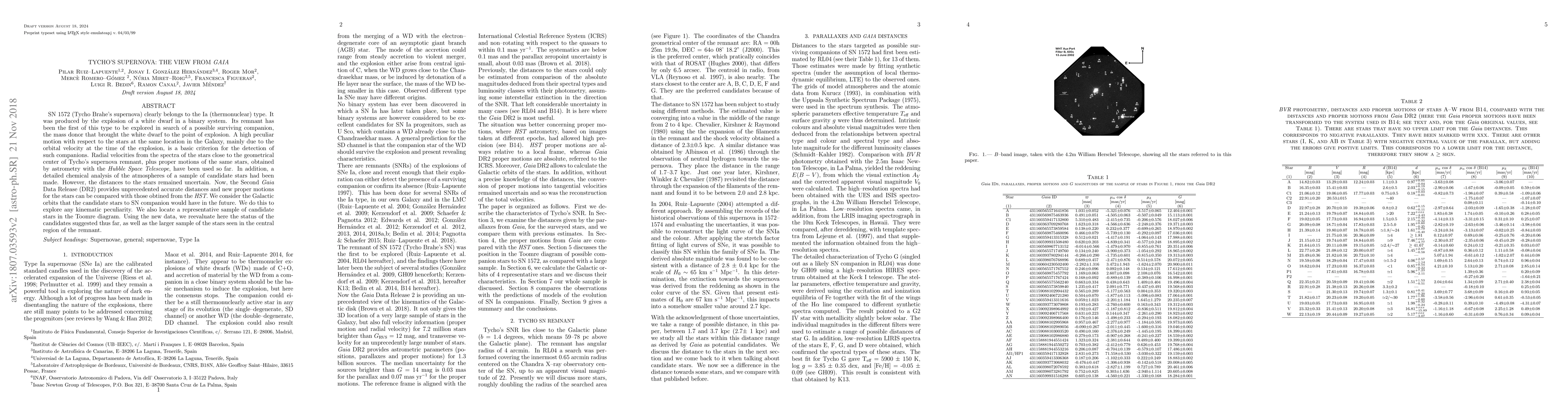 SN 1572 (Tycho Brahe's supernova) clearly belongs to the Ia (thermonuclear) type. It was produced by the explosion of a white dwarf in a binary system. Its remnant has been the first of this type to be explored in search of a possible surviving companion, the mass donor that brought the white dwarf to the point of explosion. A high peculiar motion with respect to the stars at the same location in the Galaxy, mainly due to the orbital velocity at the time of the explosion, is a basic criterion for the detection of such companions. Radial velocities from the spectra of the stars close to the geometrical center of Tycho's supernova remnant, plus proper motions of the same stars, obtained by astrometry with the {\it Hubble Space Telescope}, have been used so far. In addition, a detailed chemical analysis of the atmospheres of a sample of candidate stars had been made. However, the distances to the stars, remained uncertain. Now, the Second {\it Gaia} Data Release (DR2) provides unprecedent accurate distances and new proper motions for the stars can be compared with those made from the {\it HST}. We consider the Galactic orbits that the candidate stars to SN companion would have in the future. We do this to explore kinematic peculiarity. We also locate a representative sample of candidate stars in the Toomre diagram. Using the new data, we reevaluate here the status of the candidates suggested thus far, as well as the larger sample of the stars seen in the central region of the remnant.