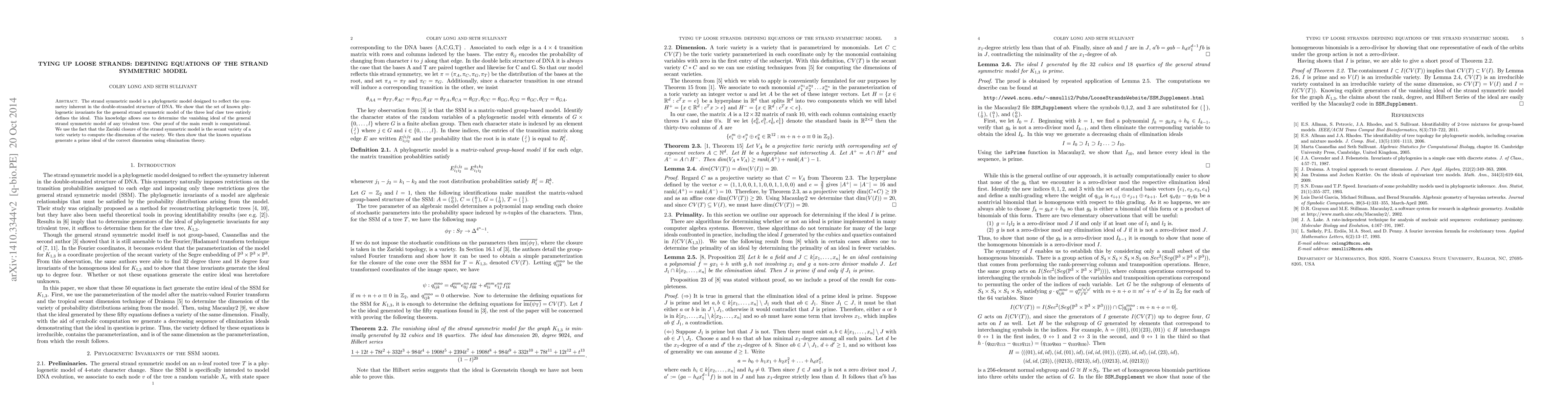The strand symmetric model is a phylogenetic model designed to reflect the symmetry inherent in the double-stranded structure of DNA. We show that the set of known phylogenetic invariants for the general strand symmetric model of the three leaf claw tree entirely defines the ideal. This knowledge allows one to determine the vanishing ideal of the general strand symmetric model of any trivalent tree. Our proof of the main result is computational. We use the fact that the Zariski closure of the strand symmetric model is the secant variety of a toric variety to compute the dimension of the variety. We then show that the known equations generate a prime ideal of the correct dimension using elimination theory.