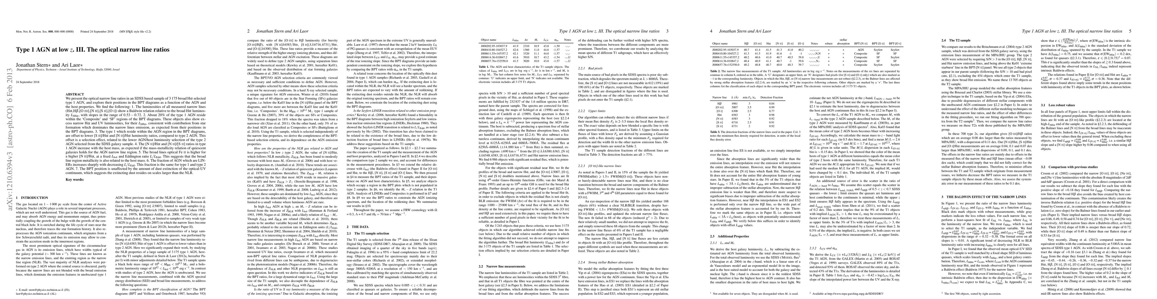 The study analyzes the optical narrow line ratios in a sample of 3,175 broad Ha selected type 1 AGN from the SDSS, exploring their positions in BPT diagrams as a function of AGN and host properties.