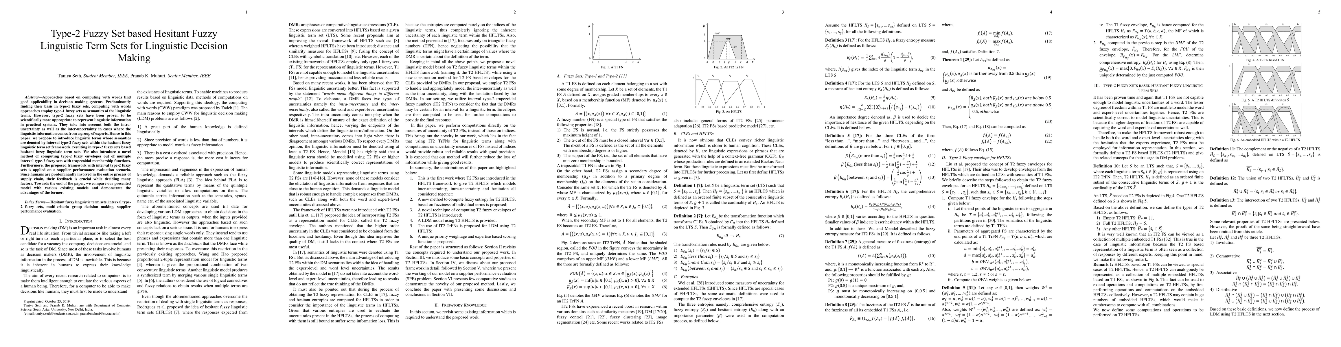 This paper proposes a type-2 fuzzy set based hesitant fuzzy linguistic term set framework for linguistic decision making, incorporating interval type-2 fuzzy sets to manage intra- and inter-uncertainty from expert opinions. The model is demonstrated through a supplier performance evaluation, showing its advantages over existing methods.