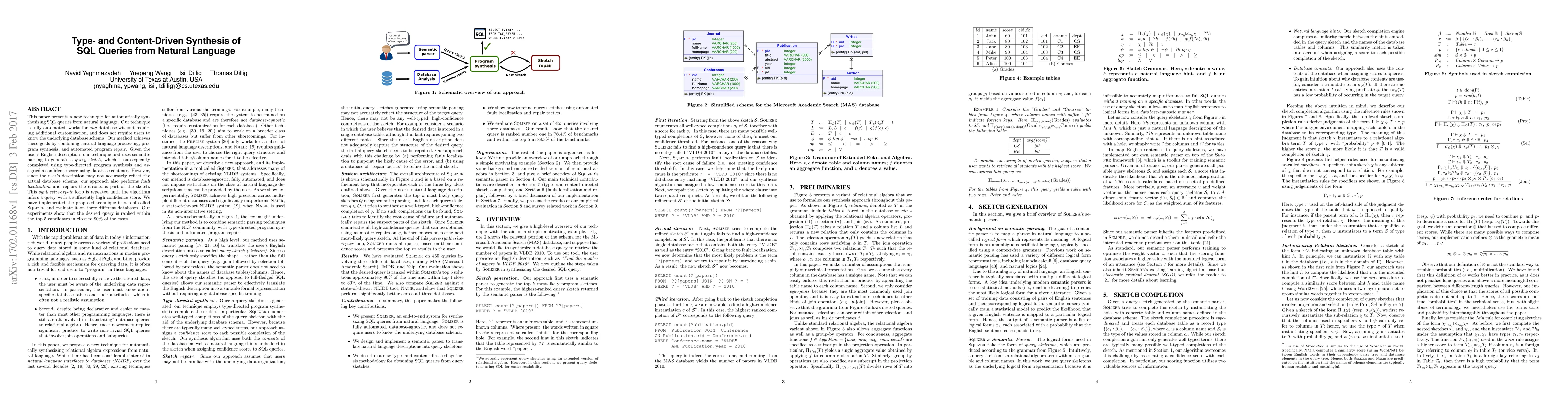 This paper introduces an automated technique for generating SQL queries from natural language, combining NLP, program synthesis, and repair to adapt to varying database schemas without requiring user knowledge of the schema. The approach involves semantic parsing, type-directed synthesis, and a synthesize-repair loop, achieving high query accuracy.