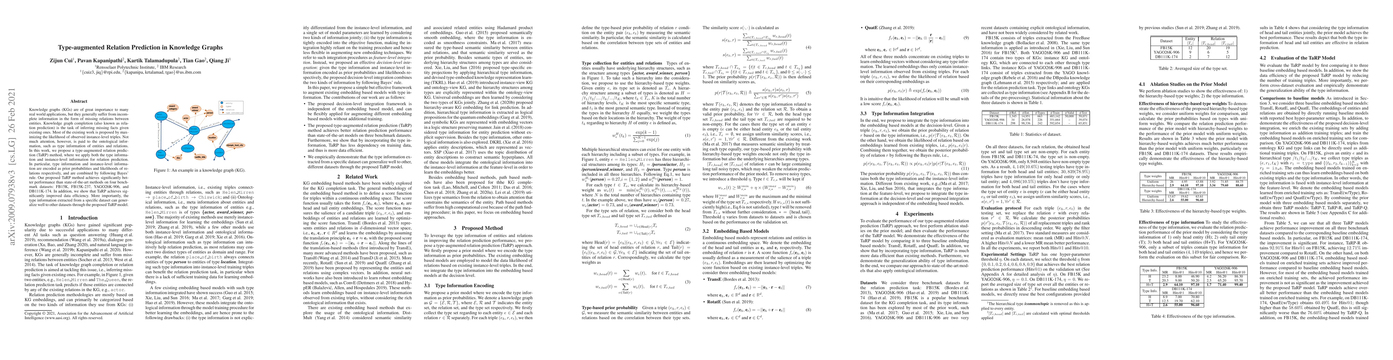 This research introduces a Type-augmented Relation Prediction (TaRP) method for Knowledge Graphs, combining type information and instance-level data using Bayes' rule. TaRP significantly outperforms existing methods on benchmark datasets and demonstrates improved data efficiency, with type information generalizing well across datasets.