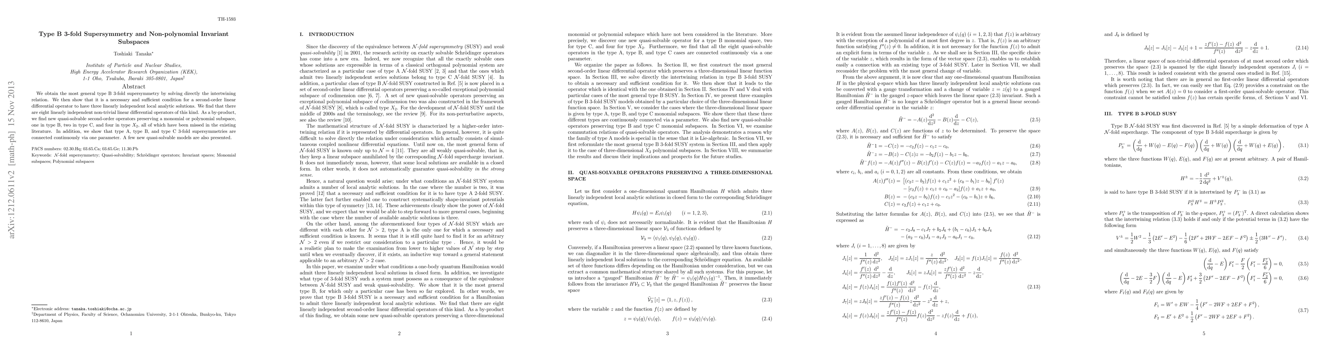 We obtain the most general type B 3-fold supersymmetry by solving directly the intertwining relation. We then show that it is a necessary and sufficient condition for a second-order linear differential operator to have three linearly independent local analytic solutions. We find that there are eight linearly independent non-trivial linear differential operators of this kind. As a by-product, we find new quasi-solvable second-order operators preserving a monomial or polynomial subspace, one in type B, two in type C, and four in type X_2, all of which have been missed in the existing literature. In addition, we show that type A, type B, and type C 3-fold supersymmetries are connected continuously via one parameter. A few new quasi-solvable models are also presented.