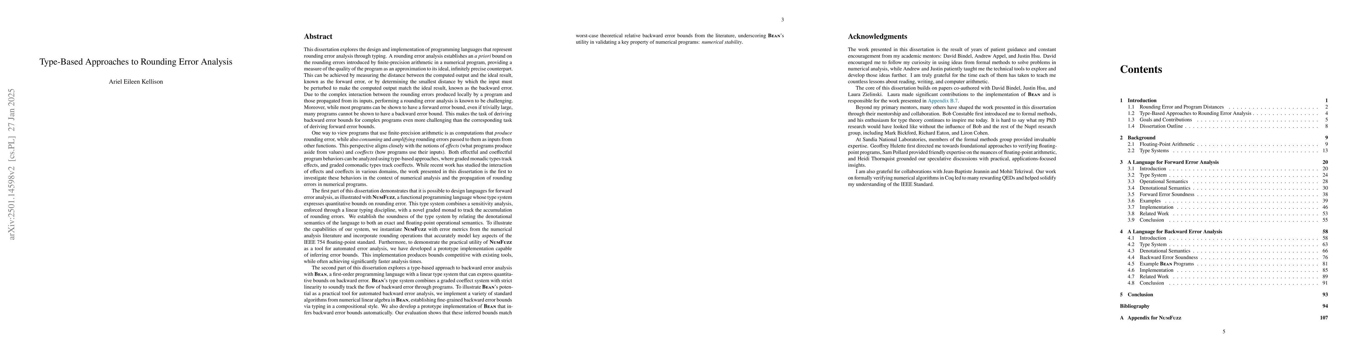 This dissertation explores the design and implementation of programming languages that represent rounding error analysis through typing. The first part of this dissertation demonstrates that it is possible to design languages for forward error analysis, as illustrated with NumFuzz, a functional programming language whose type system expresses quantitative bounds on rounding error. This type system combines a sensitivity analysis, enforced through a linear typing discipline, with a novel graded monad to track the accumulation of rounding errors. We establish the soundness of the type system by relating the denotational semantics of the language to both an exact and floating-point operational semantics. To demonstrate the practical utility of NumFuzz as a tool for automated error analysis, we have developed a prototype implementation capable of automatically inferring error bounds. Our implementation produces bounds competitive with existing tools, while often achieving significantly faster analysis times. The second part of this dissertation explores a type-based approach to backward error analysis with Bean, a first-order programming language with a linear type system that can express quantitative bounds on backward error. Bean's type system combines a graded coeffect system with strict linearity to soundly track the flow of backward error through programs. To illustrate Bean's potential as a practical tool for automated backward error analysis, we implement a variety of standard algorithms from numerical linear algebra in Bean, establishing fine-grained backward error bounds via typing in a compositional style. We also develop a prototype implementation of Bean that infers backward error bounds automatically. Our evaluation shows that these inferred bounds match worst-case theoretical relative backward error bounds from the literature.