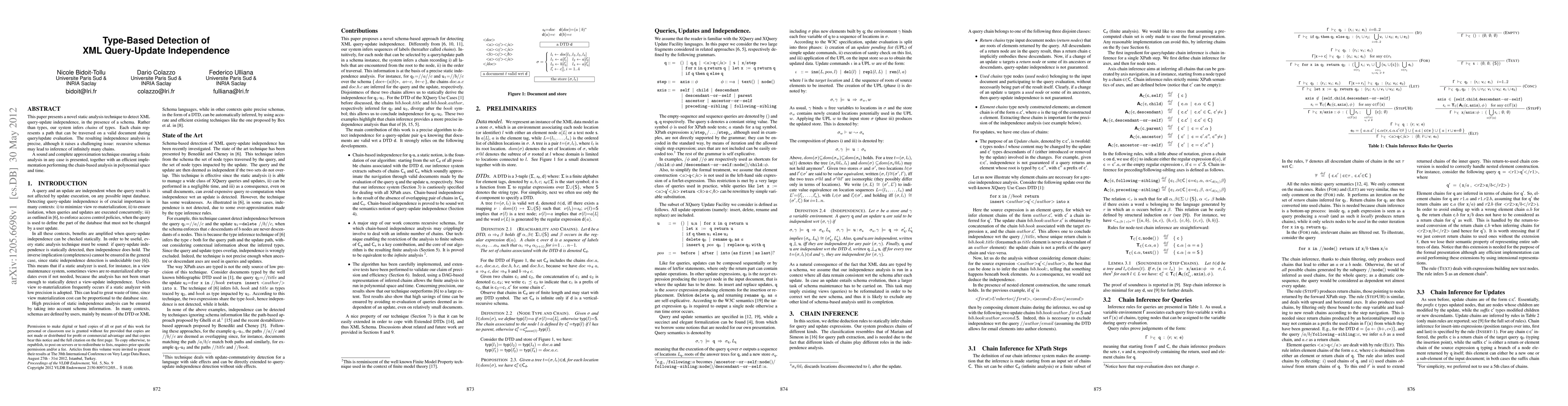 This paper introduces a static analysis method to determine XML query-update independence using inferred type chains, addressing the challenge of recursive schemas with a sound and complete approximation technique that ensures finite analysis in polynomial time and space.