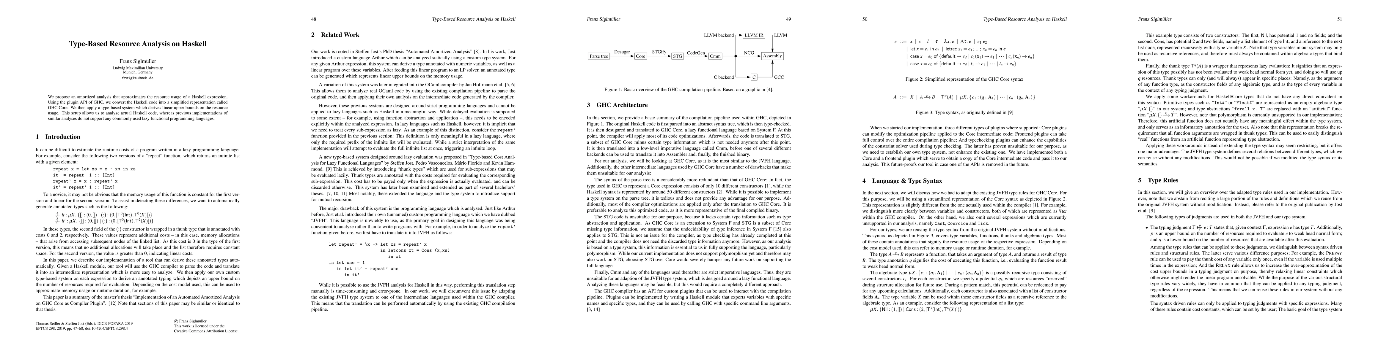 This paper introduces an amortized analysis method to estimate resource usage in Haskell by converting code to GHC Core, then applying a type-based system to derive linear upper bounds on resource consumption, enabling analysis of actual Haskell code unlike previous methods.